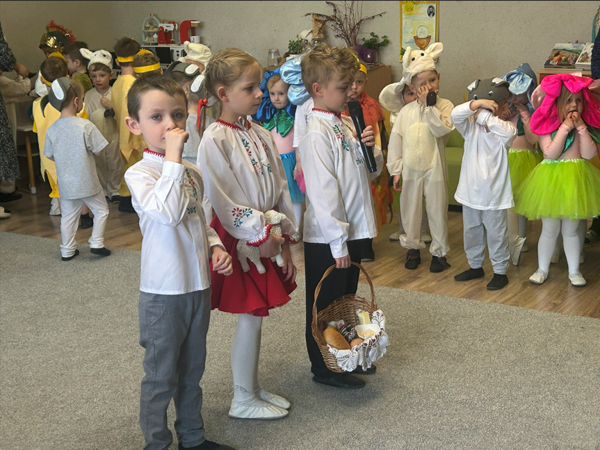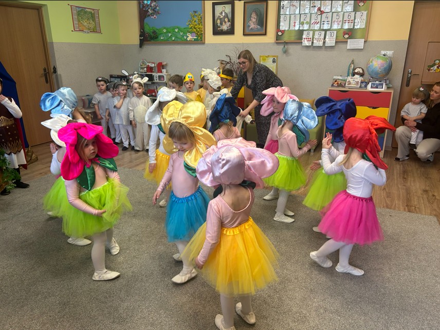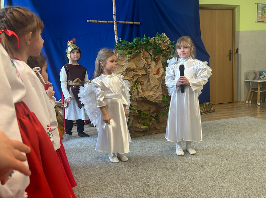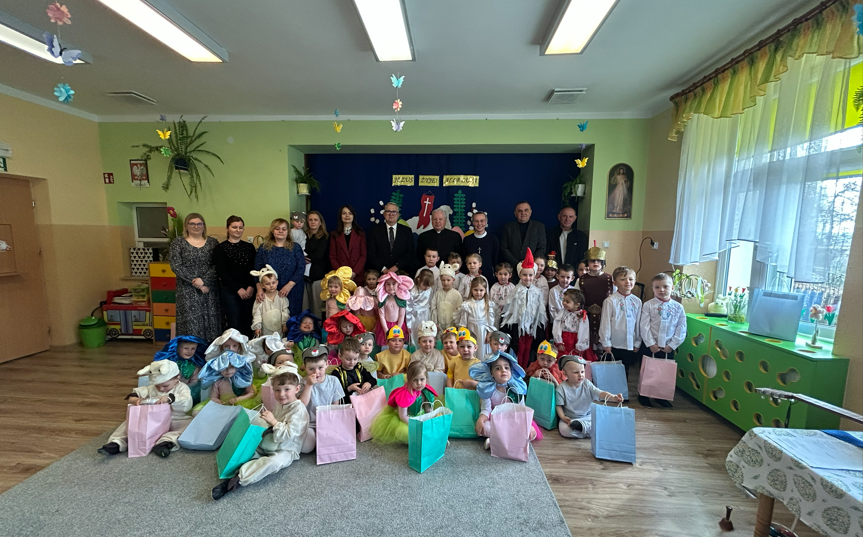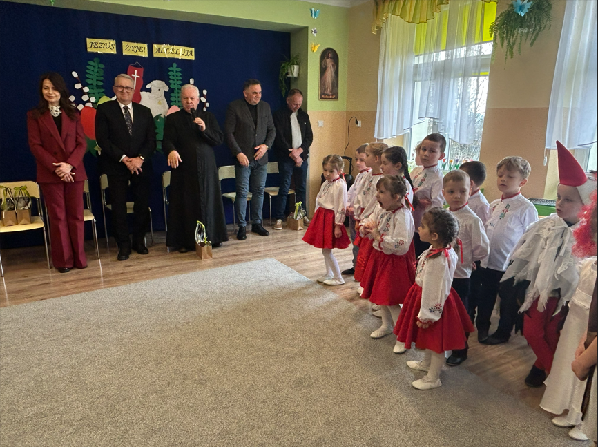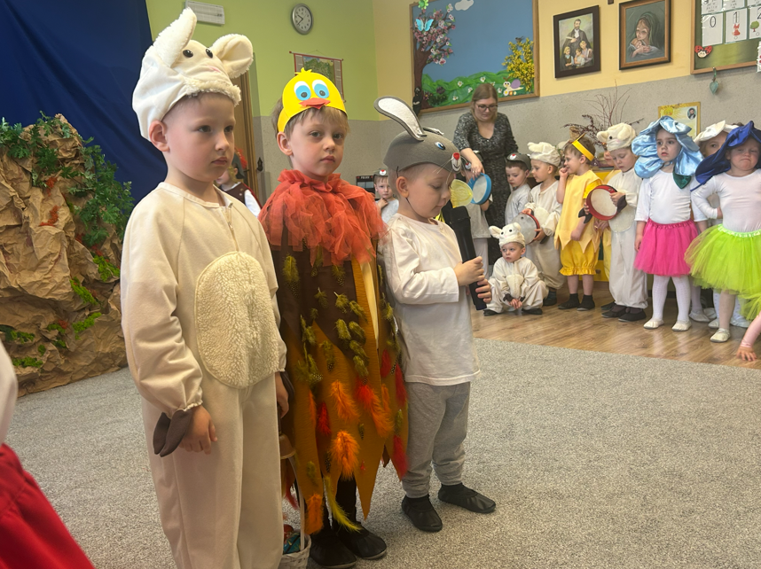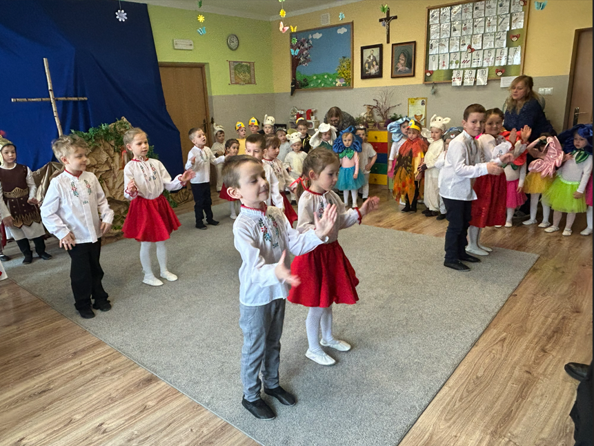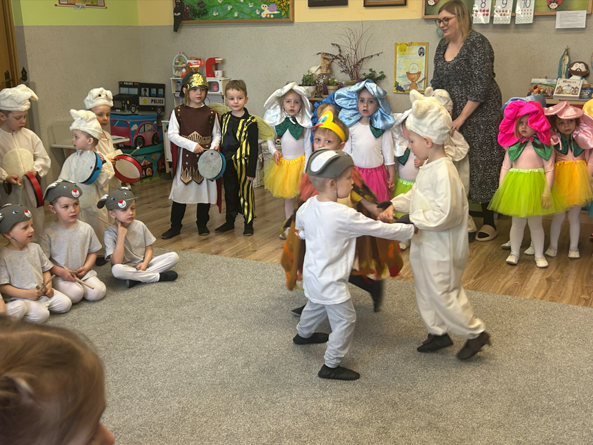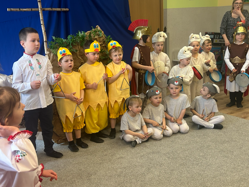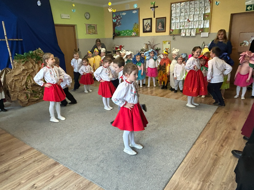 Dzieci rozpoczęły część artystyczną, nawiązując do wiosny i budzącej się przyrody, a następnie wprowadziły wszystkich w nastrój Świąt Wielkanocnych. W prosty i wzruszający sposób przedstawiły najważniejsze wydarzenia – czuwanie straży przy grobie Pana Jezusa, odsunięcie kamienia oraz radosną wiadomość o Jego Zmartwychwstaniu ogłoszoną przez aniołów. W dalszej części przedszkolaki zaprezentowały tradycje wielkanocne. Wcielając się w zajączki, baranki i kurki, poprzez śpiew, muzykę i taniec przypomniały o symbolach świąt oraz o radości, jaka płynie ze Zmartwychwstania. Na zakończenie dzieci skierowały do wszystkich gości serdeczne życzenia wielkanocne, pełne dobra, pokoju i nadziei.
