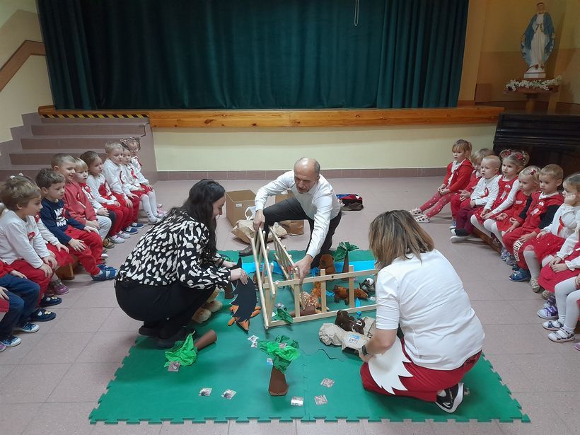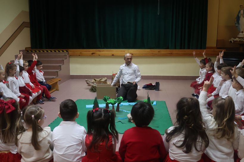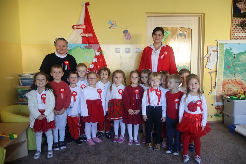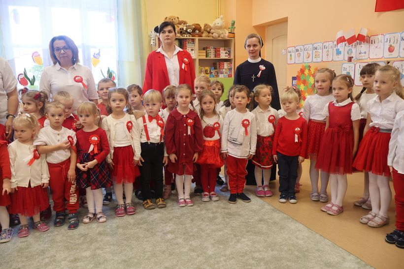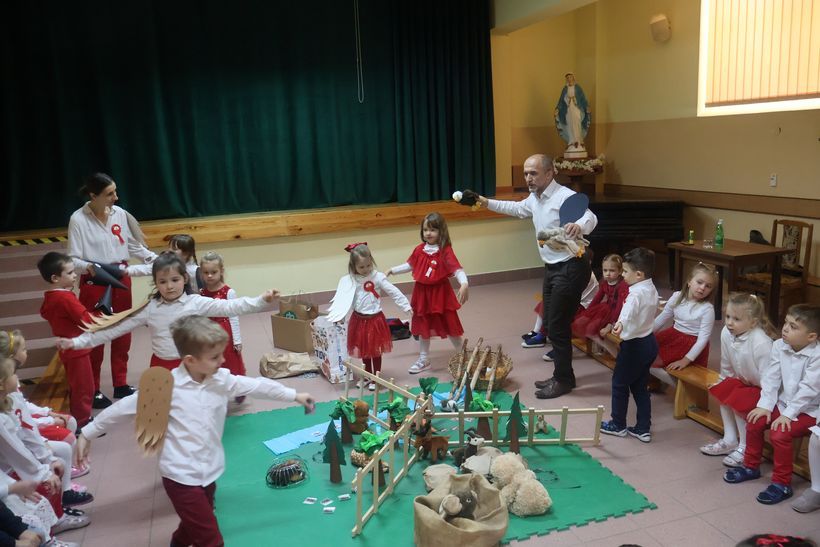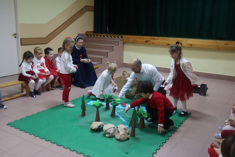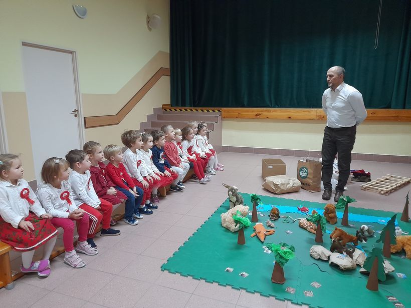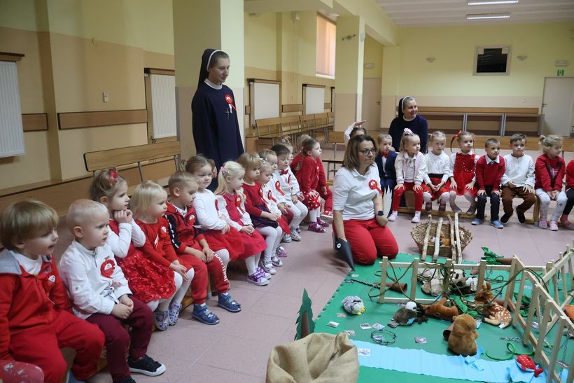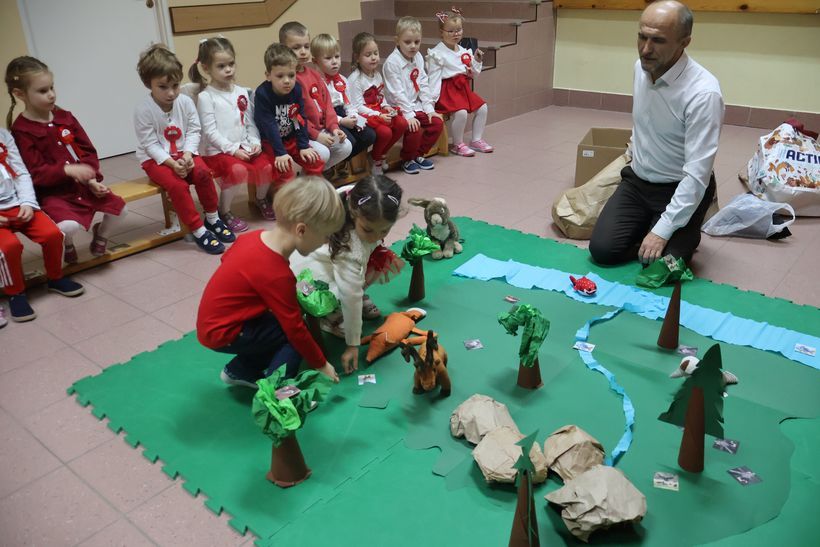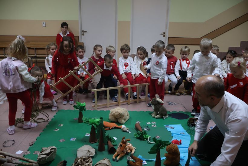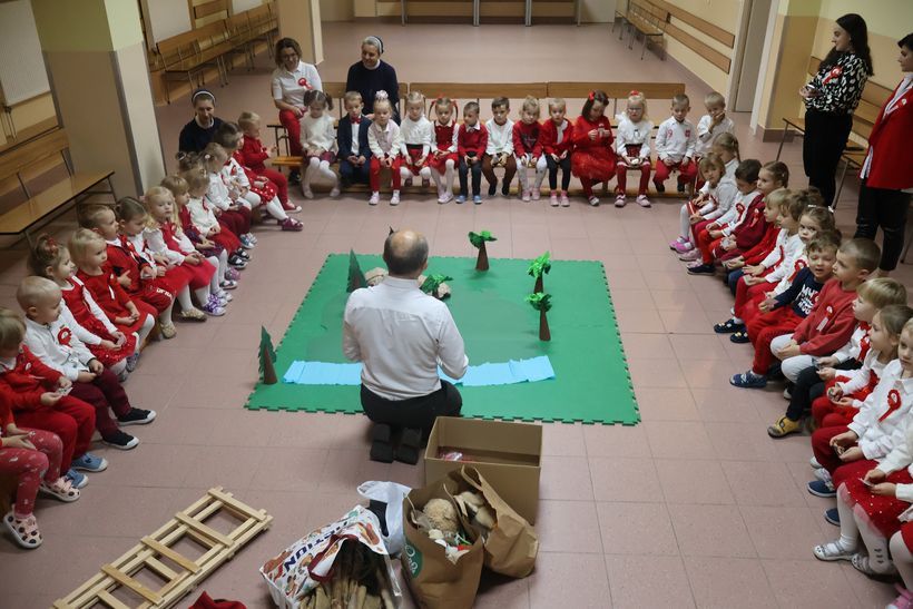 W piątek, 7 listopada 2025 roku, w naszej Ochronce obchodziliśmy Dzień Małego Polaka. Był to dzień wyjątkowy i pełen wspaniałych przeżyć. Od samego rana cała wspólnota ochronki świętowała to ważne dla każdego Polaka wydarzenie. Wszystkie dzieci przyszły ubrane w biało-czerwone barwy, tworząc przepiękne morze narodowych kolorów. W ten dzień, mieliśmy zaszczyt gościć Pana Tomasza Czaplę, Dyrektora Muzeum Regionalnego w Dębicy, który poprowadził dla przedszkolaków niezwykle ciekawe zajęcia pt. „Mały Patriota”. Pan Tomasz w sposób wyjątkowy i dostosowany do wieku dzieci opowiedział o historii rozbiorów Polski oraz drodze do odzyskania niepodległości. Wykorzystał przy tym przykłady mieszkańców lasu, co sprawiło, że opowieść stała się dla dzieci bardziej zrozumiała, atrakcyjna i łatwa do zapamiętania. Dzięki zajęciom, najmłodsi mogli pogłębić swoją wiedzę i jeszcze bardziej poczuć dumę z bycia Polakami. Punktualnie o 11:11 cała Ochronka włączyła się w ogólnopolską akcję „Szkoła do hymnu”. W podniosłej atmosferze, z powagą i wzruszeniem wspólnie odśpiewaliśmy „Mazurek Dąbrowskiego”. To był wyjątkowy moment, który połączył nas wszystkich we wspólnym przeżywaniu radości z tego, że żyjemy w wolnej Polsce.