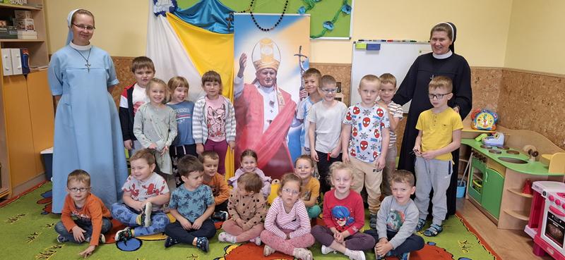 Święty Jan Paweł II to dla każdego Polaka autorytet niezastąpiony, dla dzieci, dla młodych, dla dorosłych i starszych, ponieważ dla każdego miał otwarte serce. Serce, które słuchało, kochało ale nade wszystko wymagało. Powiedział, że choćby nikt od nas nic nie wymagał – to my mamy wymagać od siebie. Słowa bardzo cenne i motywujące do pracy nad sobą. Dzieci z naszej Ochronki dziękowały za Jego słowa, za serce… Przez Jego orędownictwo polecaliśmy w modlitwie nasze Rodziny i Ojczyznę. s. Dorota