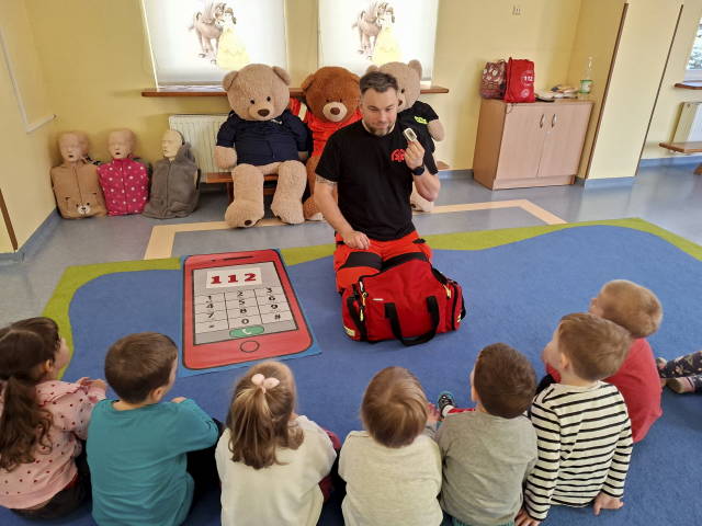 Od samego rana gościliśmy dziś w Ochronce ratownika medycznego – pana Jakuba. To było bardzo ważne spotkanie, w którym udział wzięły wszystkie przedszkolaki- małe i duże. Celem zajęć przeprowadzonych przez wykwalifikowanego ratownika medycznego było przygotowanie przedszkolaków do wykonywania prostych czynności udzielania pierwszej pomocy oraz prawidłowego zachowania się w czasie wypadku oraz w sytuacjach zagrażających życiu lub zdrowiu. Przedszkolaki wykazały się znakomitą znajomością numerów alarmowych. Dzieci dowiedziały się, jak zgłaszać wypadek, jakie informacje podać dyspozytorowi. Uświadomiły sobie, jak ważna jest znajomość swojego imienia i nazwiska oraz miejsca zamieszkania. Dzieci uczyły się, jak sprawdzać przytomność osoby poszkodowanej i w jaki sposób można pomóc, dopóki nie przyjedzie pogotowie ratunkowe. Poznały podstawowe zabiegi resuscytacji, ćwicząc na fantomie. Zajęcia oczywiście były dostosowane swą trudnością do wieku naszych przedszkolaków. Najmłodsi opiekowali się misiami – ratownikami, a starsi mogli już zapoznać się z fantomami. Dzieci bardzo aktywnie brały udział w ćwiczeniach. Zostały pochwalone przez pana ratownika za swoją wiedzę i umiejętności. Dziękujemy za miłe i pouczające spotkanie. Przedszkolaki na pewno wiele zapamiętały z praktycznych ćwiczeń pierwszej pomocy w razie zagrożenia życia i zdrowia.