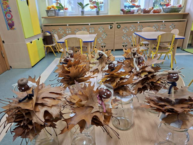 Jesień to piękna pora roku. Liście dębów, brzóz i innych drzew żółkną, czerwienią się i przybierają ciekawe ubarwienie, by później upaść i razem z innymi tworzyć kolorowy jesienny dywan. Grupa Biedronek dnia 23.10.2025 wybrała się na spacer w poszukiwaniu kolorowych liść. Dzieci obserwowały jesienny krajobraz, wypowiadały się na temat swoich spostrzeżeń, rozpoznawały drzewa oraz ich liście. Opisywały wygląd znalezionych liści. Z tych liści wykonywały własnego „liściastego ludka”, by następnie upiękrzyć je w Ochronce. Prace były bardzo ciekawe i pomysłowe. Celem zabaw związanych z tematyką jesienną było utrwalenie wiadomości o różnych rodzajach drzew. Obserwowanie zmian zachodzących w przyrodzie jesienią i wiązanie tych zmian z aktualną porą roku, integrowanie się dzieci, a przede wszystkim wspaniała zabawa. Nie zabrakło modlitwy do Matki Bożej, której figura stała pośród jesiennego dywanu z liści. Było pięknie.