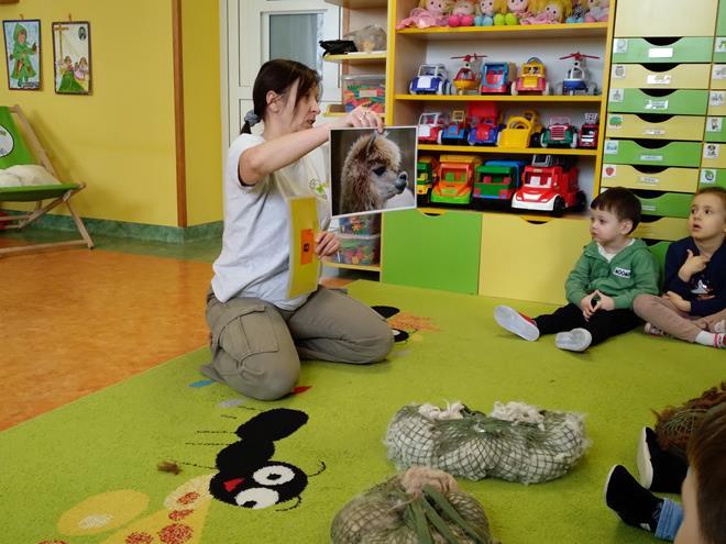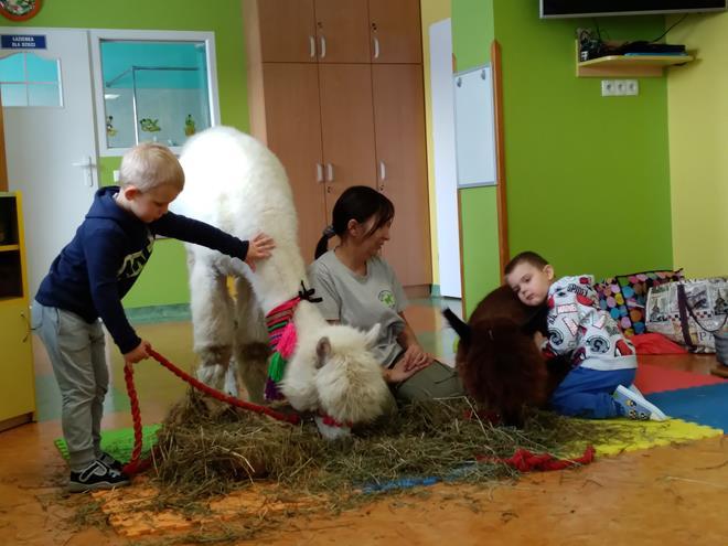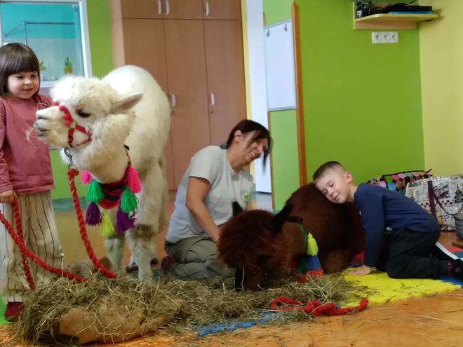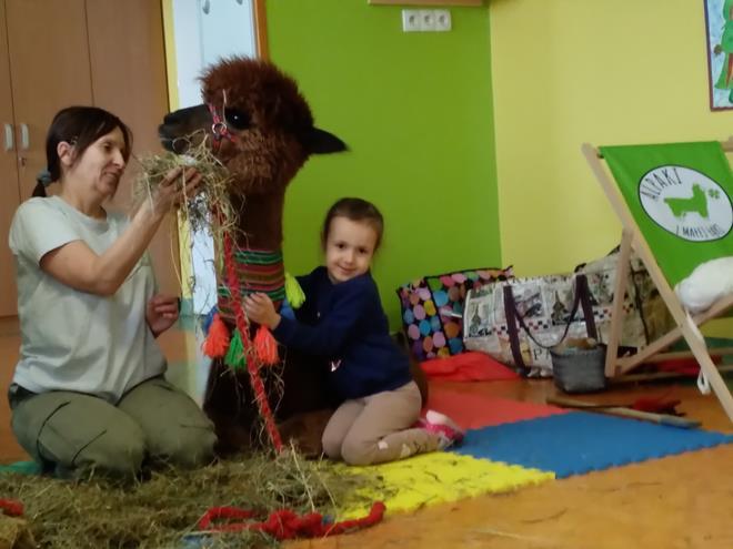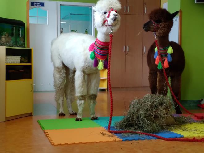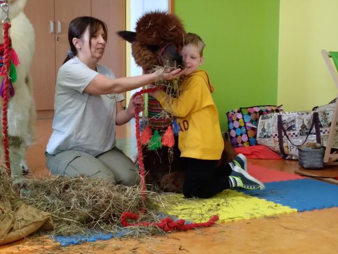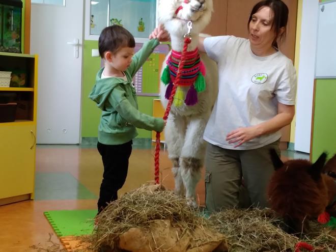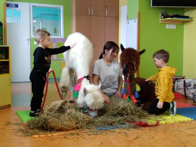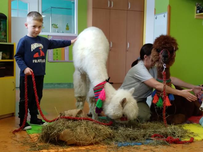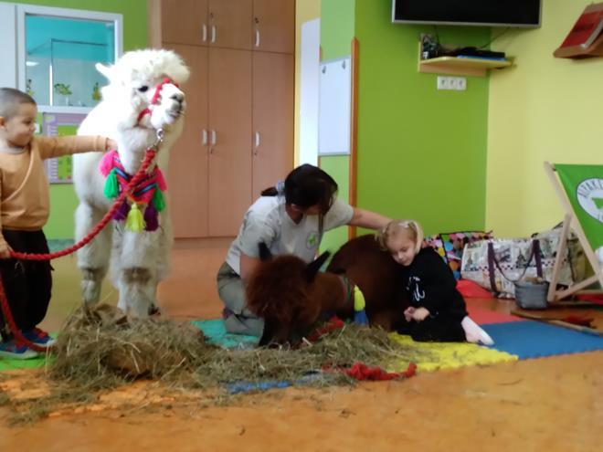 Naszą Ochronkę odwiedzili niecodzienni goście. A kto to taki?- To alpaki – Maniek i Felek z „Małej Łąki”. Dzieci uczestnicząc w warsztatach edukacyjnych dowiedziały się jak wygląda pielęgnacja tych zwierząt, jaki jest ich ulubiony przysmak. Pani opowiedziała także o sposobie pozyskiwania wełny, która jest wykorzystywana do produkcji odzieży. Pokazała nam też czapkę, szalik, rękawiczki zrobione właśnie z wełny alpaka. Mogliśmy się przekonać jak miękka, lekka i przyjemna w dotyku jest ta wełna. Każde dziecko mogło je nakarmić i przytulić. Wizyta alpak sprawiła dzieciom dużo radości, a dla niektórych była to doskonała okazja do zmierzenia się z własnym lękiem. Te niewielkie zwierzęta podobne do lamy są doskonałymi zwierzęcymi terapeutami o dużej wrażliwości i empatii. s. Jadwiga Tomaszewska