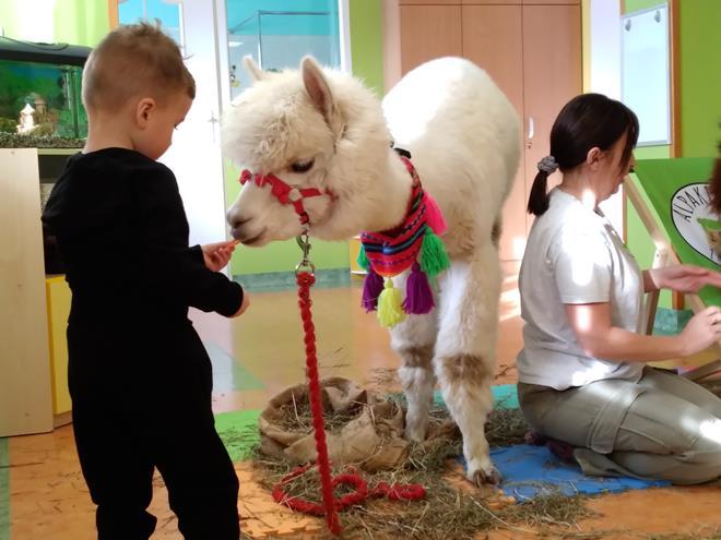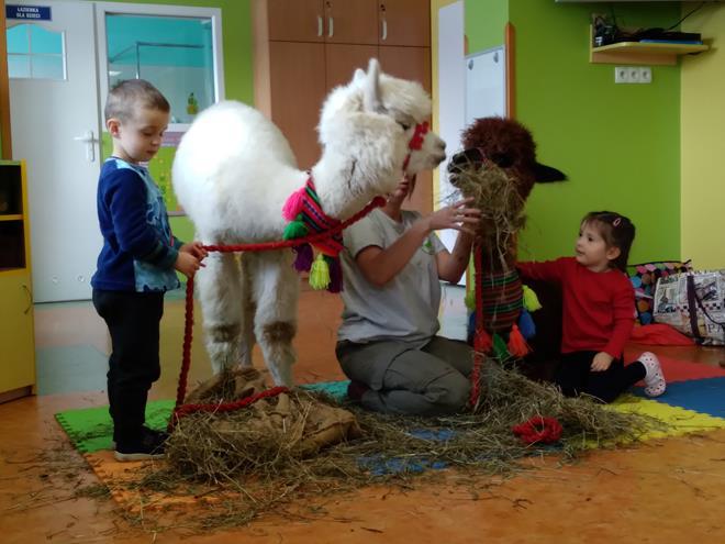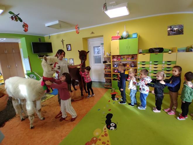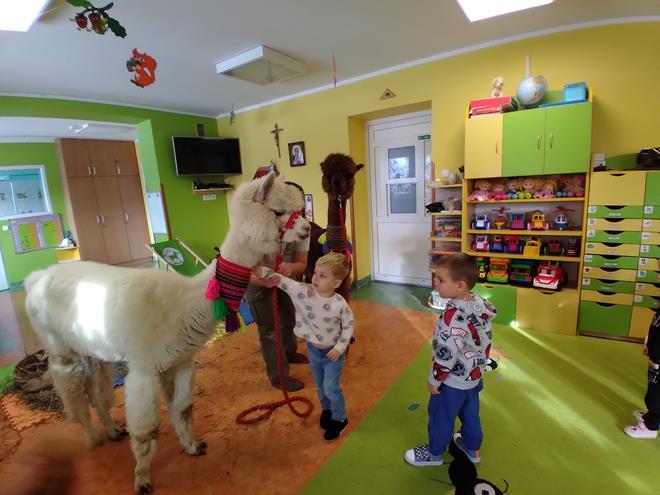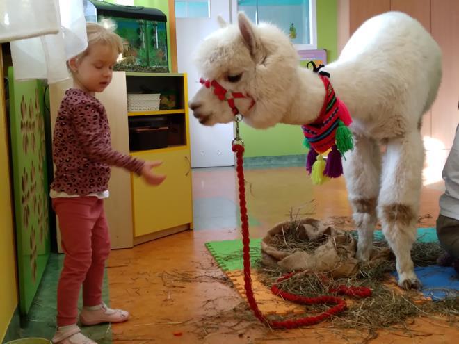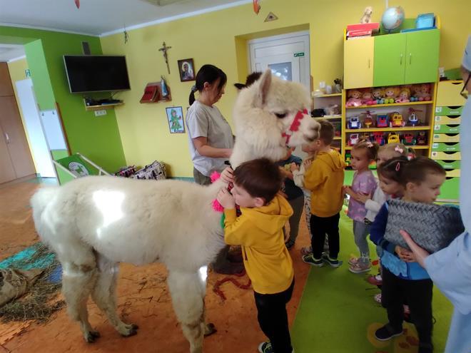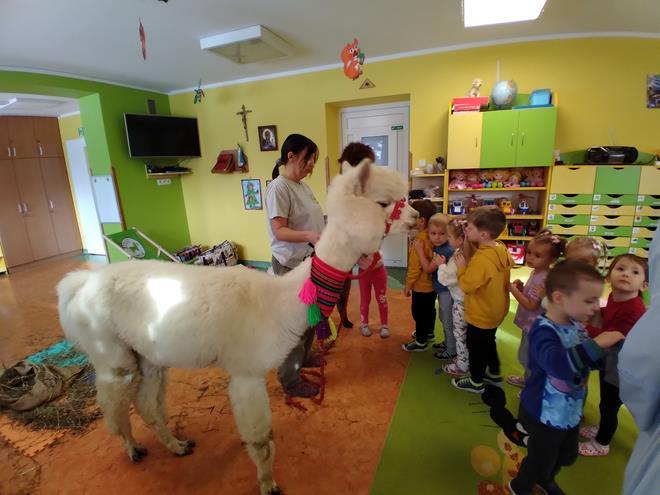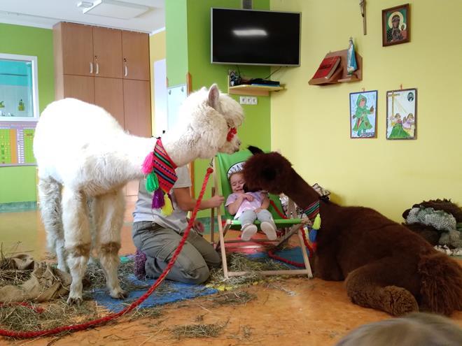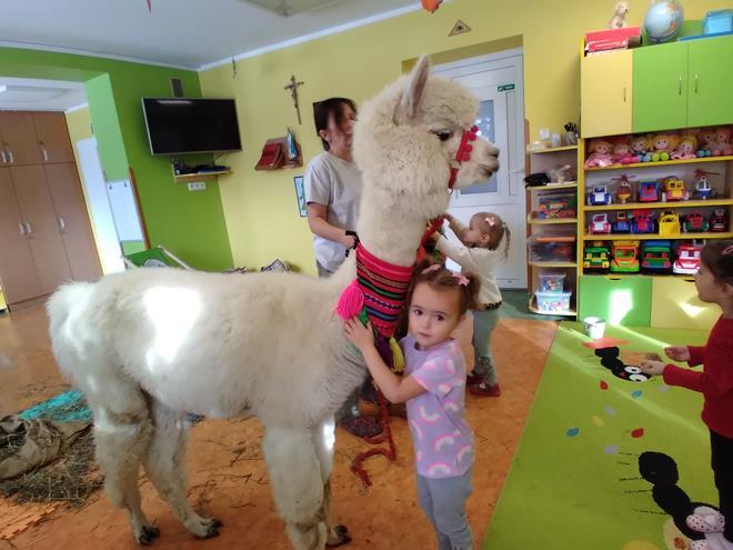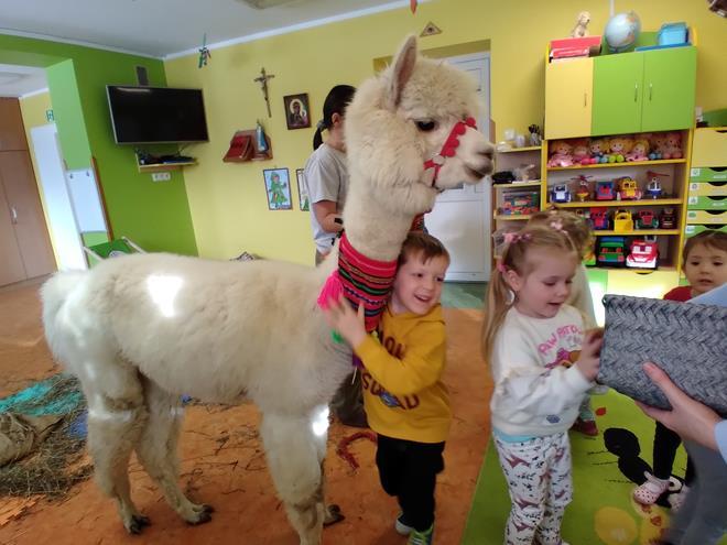 Naszą Ochronkę odwiedzili niecodzienni goście. A kto to taki?- To alpaki – Maniek i Felek z „Małej Łąki”. Dzieci uczestnicząc w warsztatach edukacyjnych dowiedziały się jak wygląda pielęgnacja tych zwierząt, jaki jest ich ulubiony przysmak. Pani opowiedziała także o sposobie pozyskiwania wełny, która jest wykorzystywana do produkcji odzieży. Pokazała nam też czapkę, szalik, rękawiczki zrobione właśnie z wełny alpaka. Mogliśmy się przekonać jak miękka, lekka i przyjemna w dotyku jest ta wełna. Każde dziecko mogło je nakarmić i przytulić. Wizyta alpak sprawiła dzieciom dużo radości, a dla niektórych była to doskonała okazja do zmierzenia się z własnym lękiem. Te niewielkie zwierzęta podobne do lamy są doskonałymi zwierzęcymi terapeutami o dużej wrażliwości i empatii. s. Jadwiga Tomaszewska