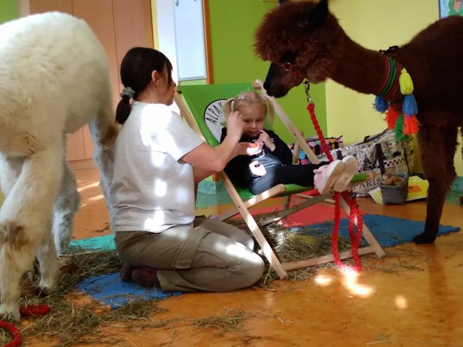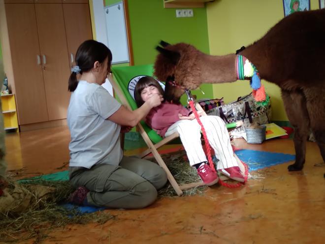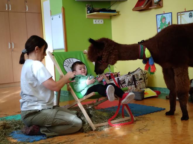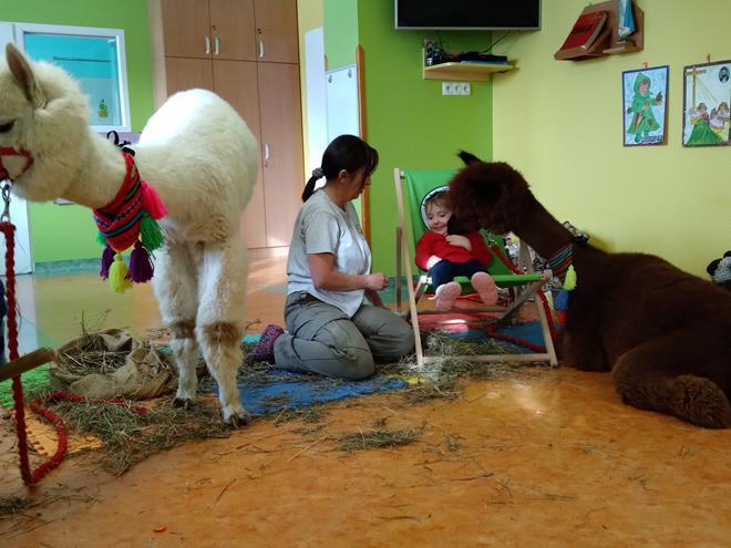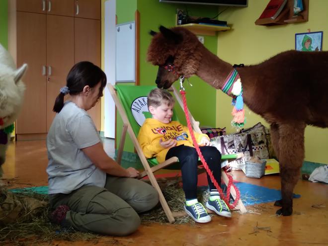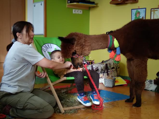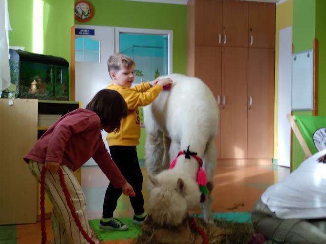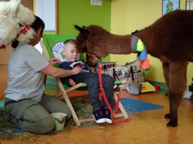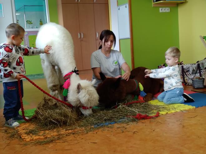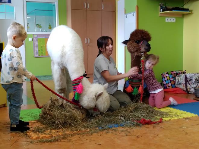 Naszą Ochronkę odwiedzili niecodzienni goście. A kto to taki?- To alpaki – Maniek i Felek z „Małej Łąki”. Dzieci uczestnicząc w warsztatach edukacyjnych dowiedziały się jak wygląda pielęgnacja tych zwierząt, jaki jest ich ulubiony przysmak. Pani opowiedziała także o sposobie pozyskiwania wełny, która jest wykorzystywana do produkcji odzieży. Pokazała nam też czapkę, szalik, rękawiczki zrobione właśnie z wełny alpaka. Mogliśmy się przekonać jak miękka, lekka i przyjemna w dotyku jest ta wełna. Każde dziecko mogło je nakarmić i przytulić. Wizyta alpak sprawiła dzieciom dużo radości, a dla niektórych była to doskonała okazja do zmierzenia się z własnym lękiem. Te niewielkie zwierzęta podobne do lamy są doskonałymi zwierzęcymi terapeutami o dużej wrażliwości i empatii. s. Jadwiga Tomaszewska