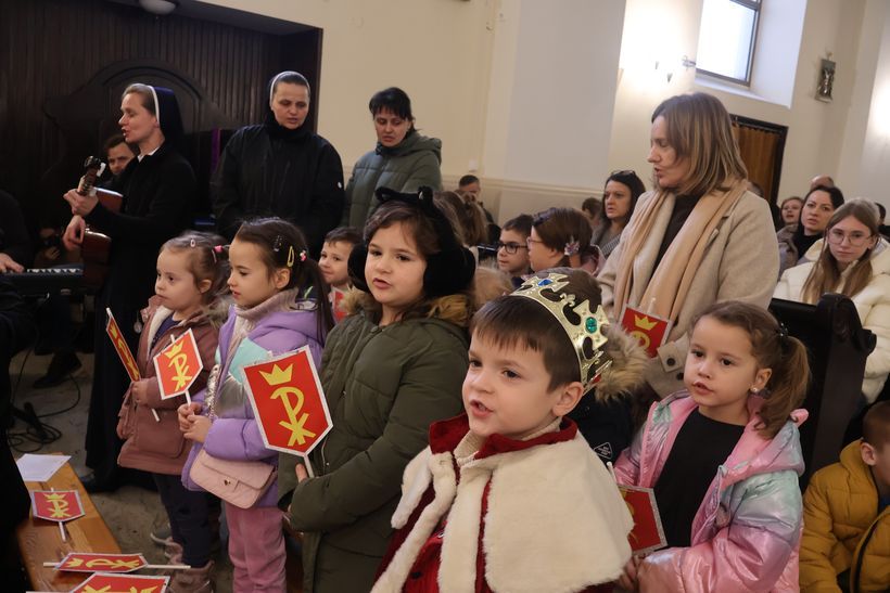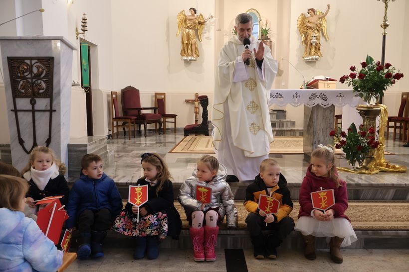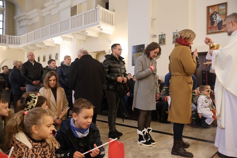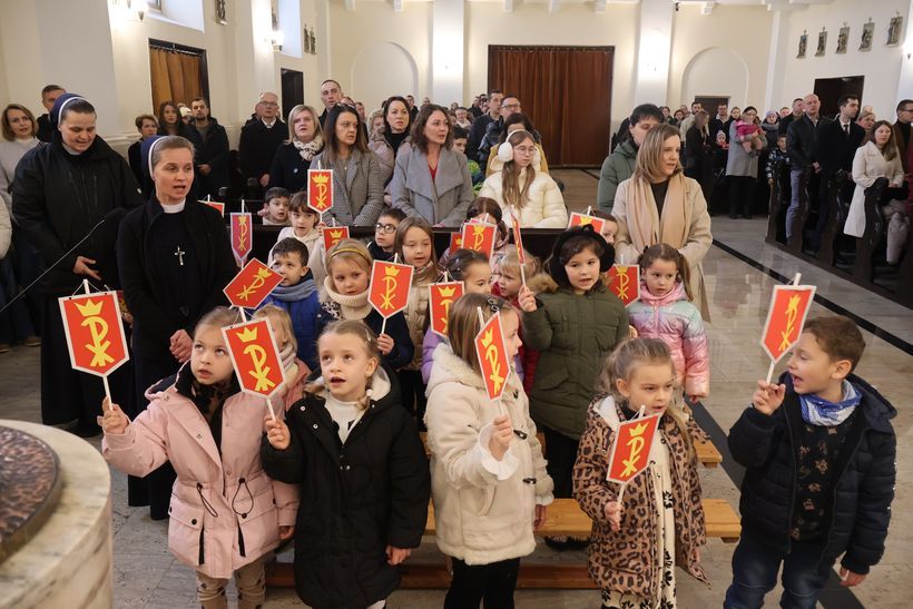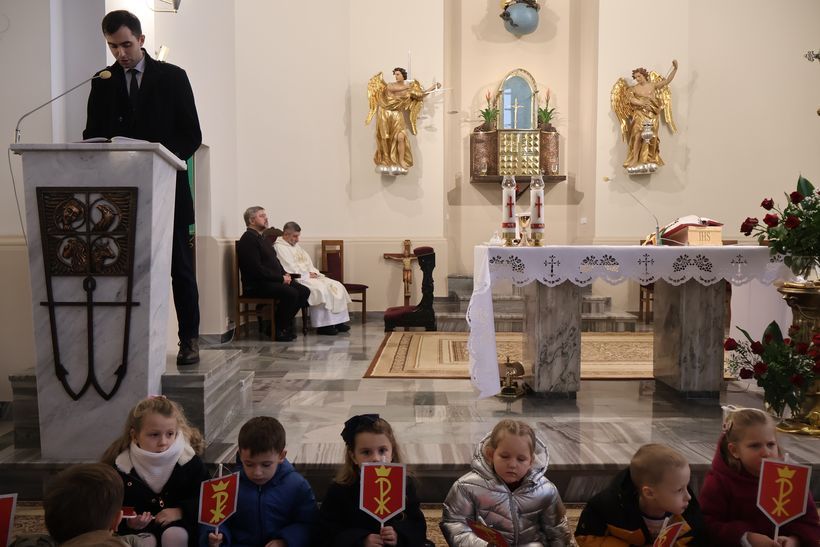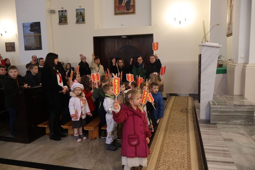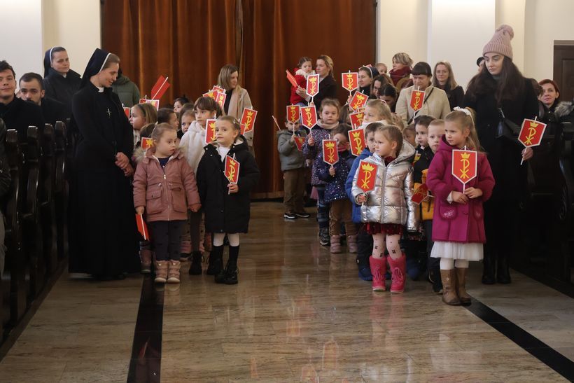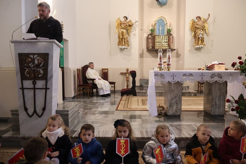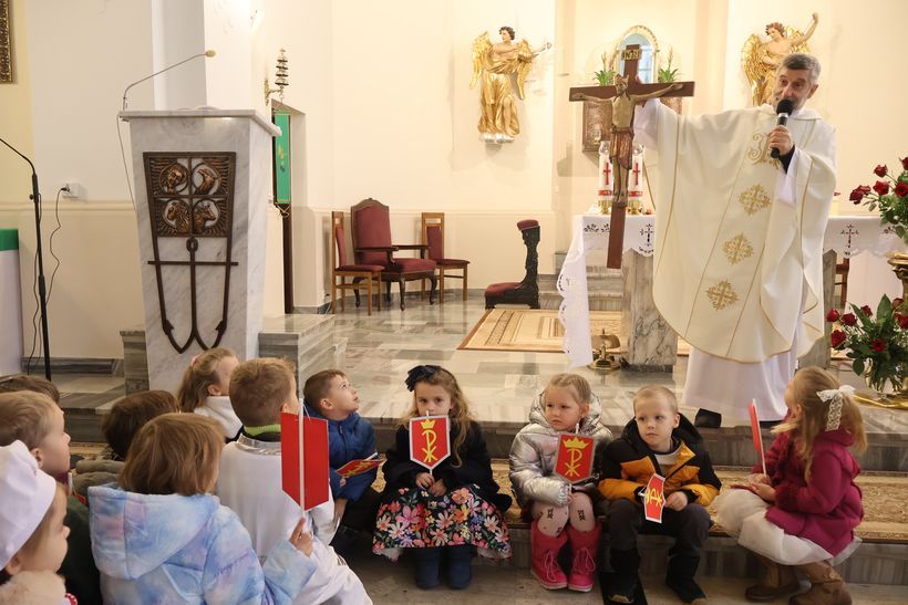 Dnia 23 listopada, cała Wspólnota naszej Ochronki uczestniczyła we Mszy Świętej w Niedzielę Chrystusa Króla Wszechświata, której przewodniczył br. Jacek Kania. Na początku liturgii dzieci z radością weszły do świątyni, niosąc przygotowane proporczyki, które podkreśliły wyjątkowy charakter tego dnia. Br. Jacek podczas homilii przypomniał, że nie jest ważne, jaką szatę nosi król — prawdziwa królewskość nie rodzi się z korony ani z bogatego stroju, lecz z serca pełnego miłości, mądrości i służby. Tak samo człowiek nie będzie dobrze wykonywał swojego zawodu tylko dlatego, że założy odpowiednie ubrania czy stworzy pozory kompetencji. Ubranie może zmienić to, co widzą inni, ale nie zmienia tego, kim naprawdę jesteśmy. Warto pamiętać: to wnętrze, charakter, uczciwość i codzienny wysiłek nadają człowiekowi godność — nie wygląd. Brat pokazał dzieciom, że bycie Królem polega na miłości, dobroci i trosce o każdego człowieka. Jezus jest Królem, który zawsze słucha, pomaga i prowadzi nas do nieba. Oprawę muzyczną ubogaciła Schola rodziców, która wspólnie z dziećmi zaśpiewała pieśni tworząc atmosferę modlitwy i jedności. Za przygotowanie liturgii odpowiedzialna była grupa „Motylków”. Rodzice aktywnie włączyli się w jej przebieg, podejmując się odczytania czytań oraz wykonania psalmu. Serdecznie dziękujemy wszystkim dzieciom, rodzicom i wychowawcom za zaangażowanie oraz wspólną, pełną wiary modlitwę. Niech Chrystus Król prowadzi nasze rodziny każdego dnia!