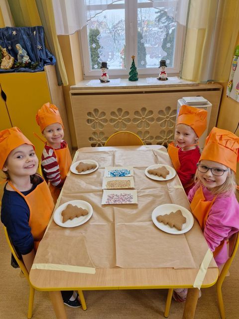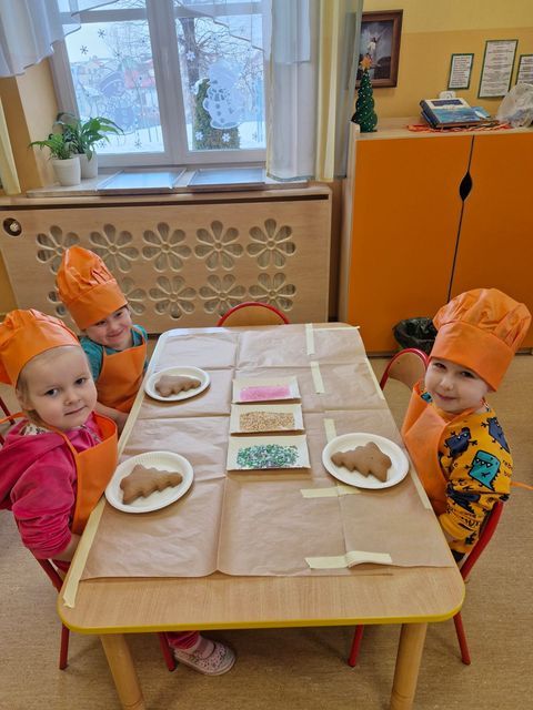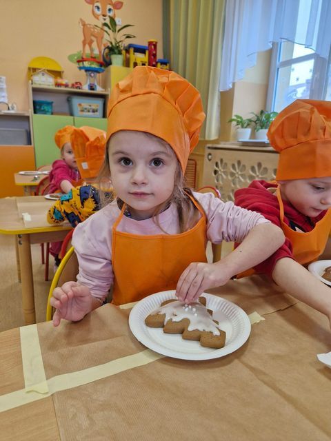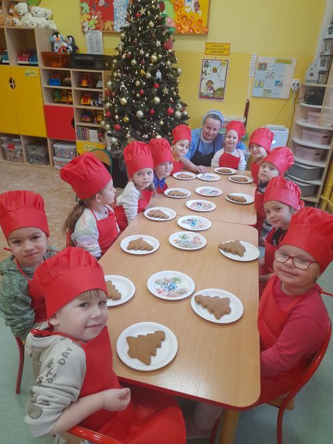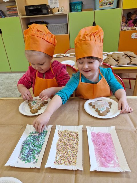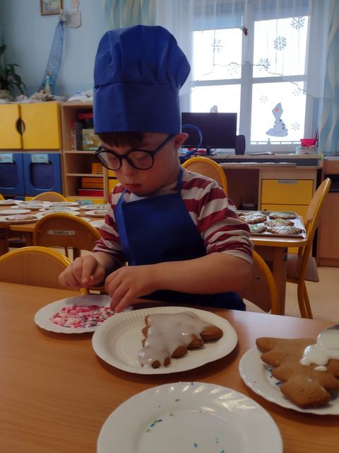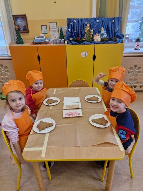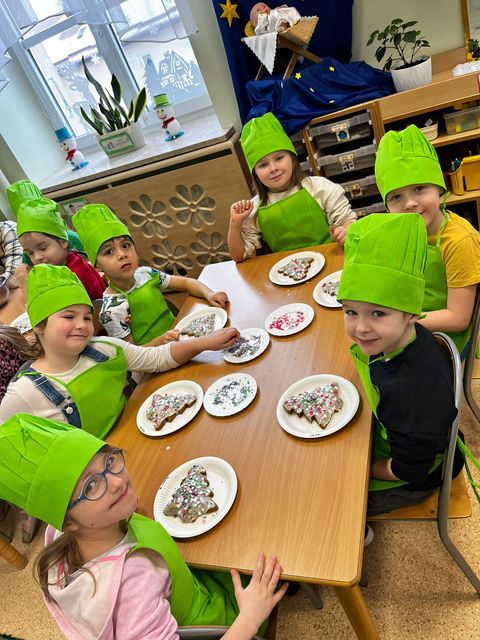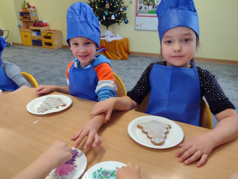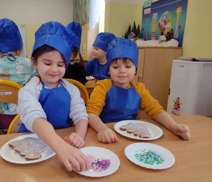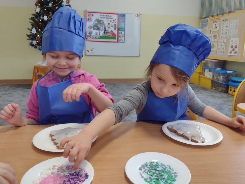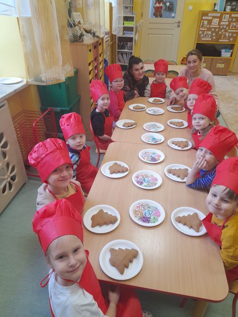 Miłość nie jedno imię ma… Po zakończonych Jasełkach, Przedszkolanki postanowiły wyrazić swoją miłość Babciom i Dziadkom w jeszcze inny sposób. W czwartkowy poranek, ubrane w kolorowe fartuszki i czapki, zabrały się pilnie do pracy. Dzieci ozdabiały piernikowe choinki lukrem i kolorową posypką, a następnie zapakowały je i przyozdobiły własnoręcznie wykonanymi papierowymi sercami z napisem: