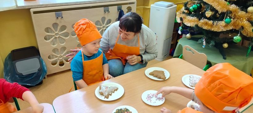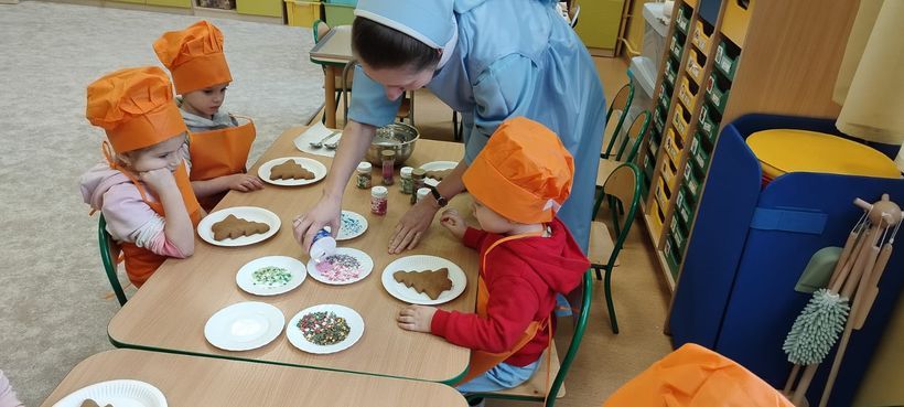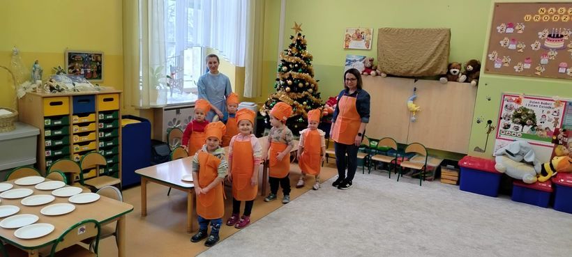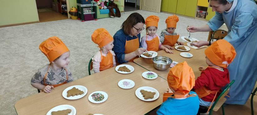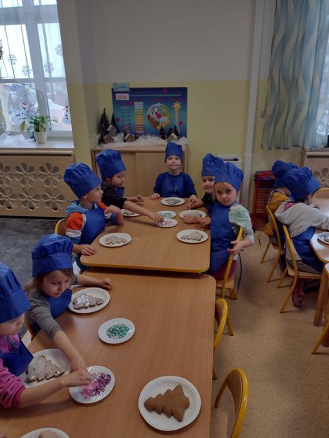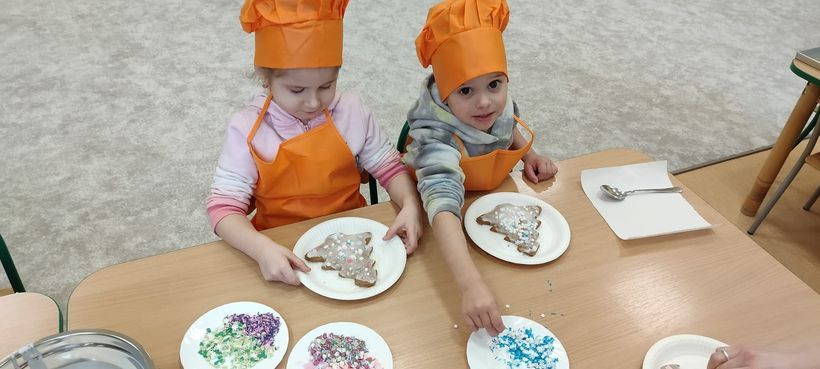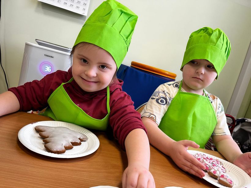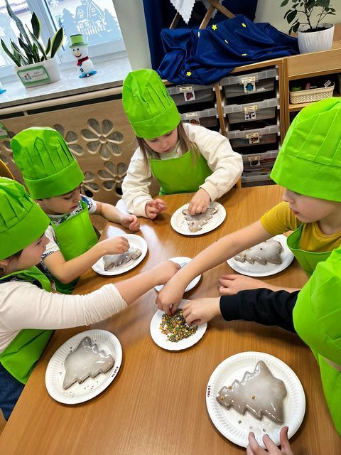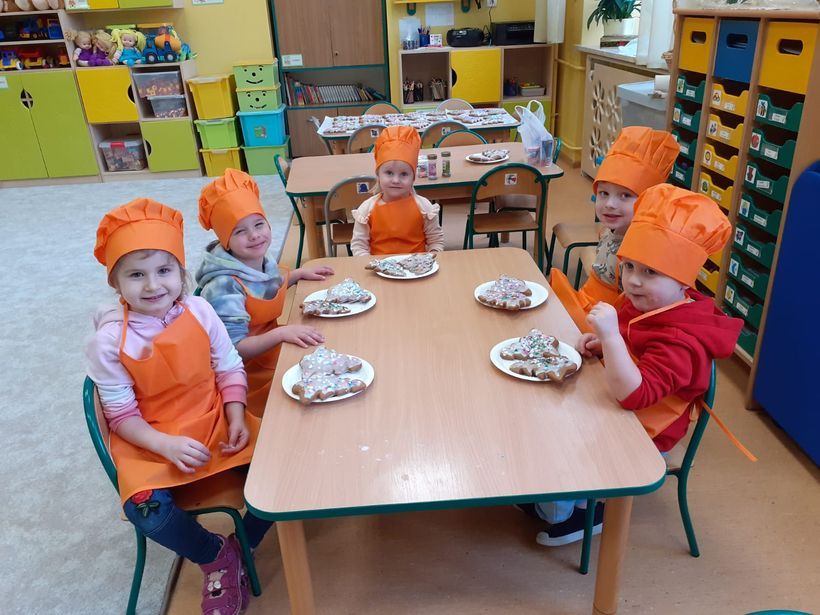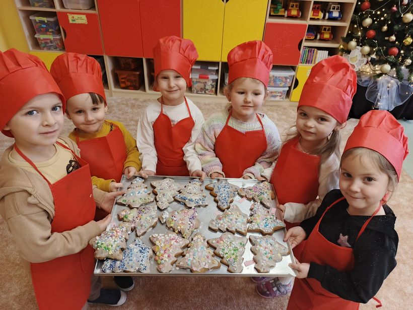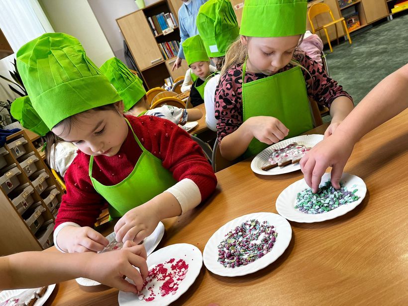Miłość nie jedno imię ma… Po zakończonych Jasełkach, Przedszkolanki postanowiły wyrazić swoją miłość Babciom i Dziadkom w jeszcze inny sposób. W czwartkowy poranek, ubrane w kolorowe fartuszki i czapki, zabrały się pilnie do pracy. Dzieci ozdabiały piernikowe choinki lukrem i kolorową posypką, a następnie zapakowały je i przyozdobiły własnoręcznie wykonanymi papierowymi sercami z napisem: