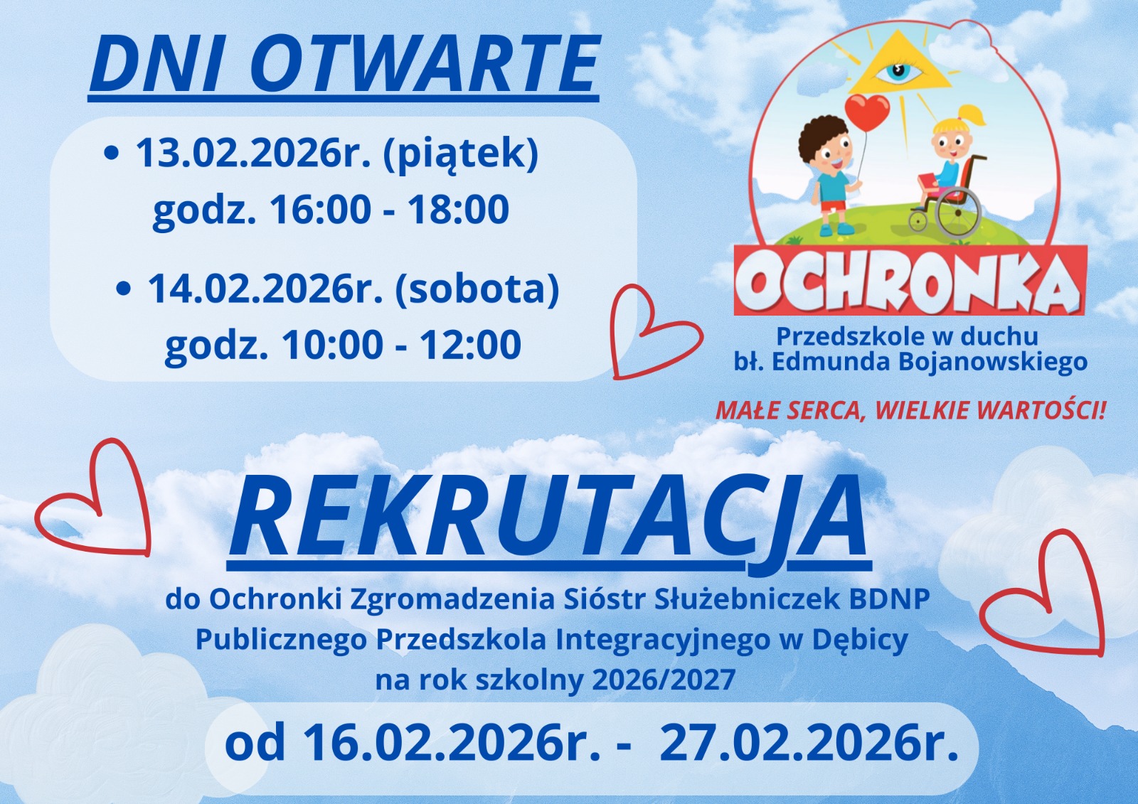REKRUTACJA na rok szkolny 2026/2027 do Ochronki Zgromadzenia Sióstr Służebniczek BDNP Publicznego Przedszkola Integracyjnego w Dębicy od 16 LUTEGO - 27 LUTEGO 2026 r. w godzinach od 8.00...