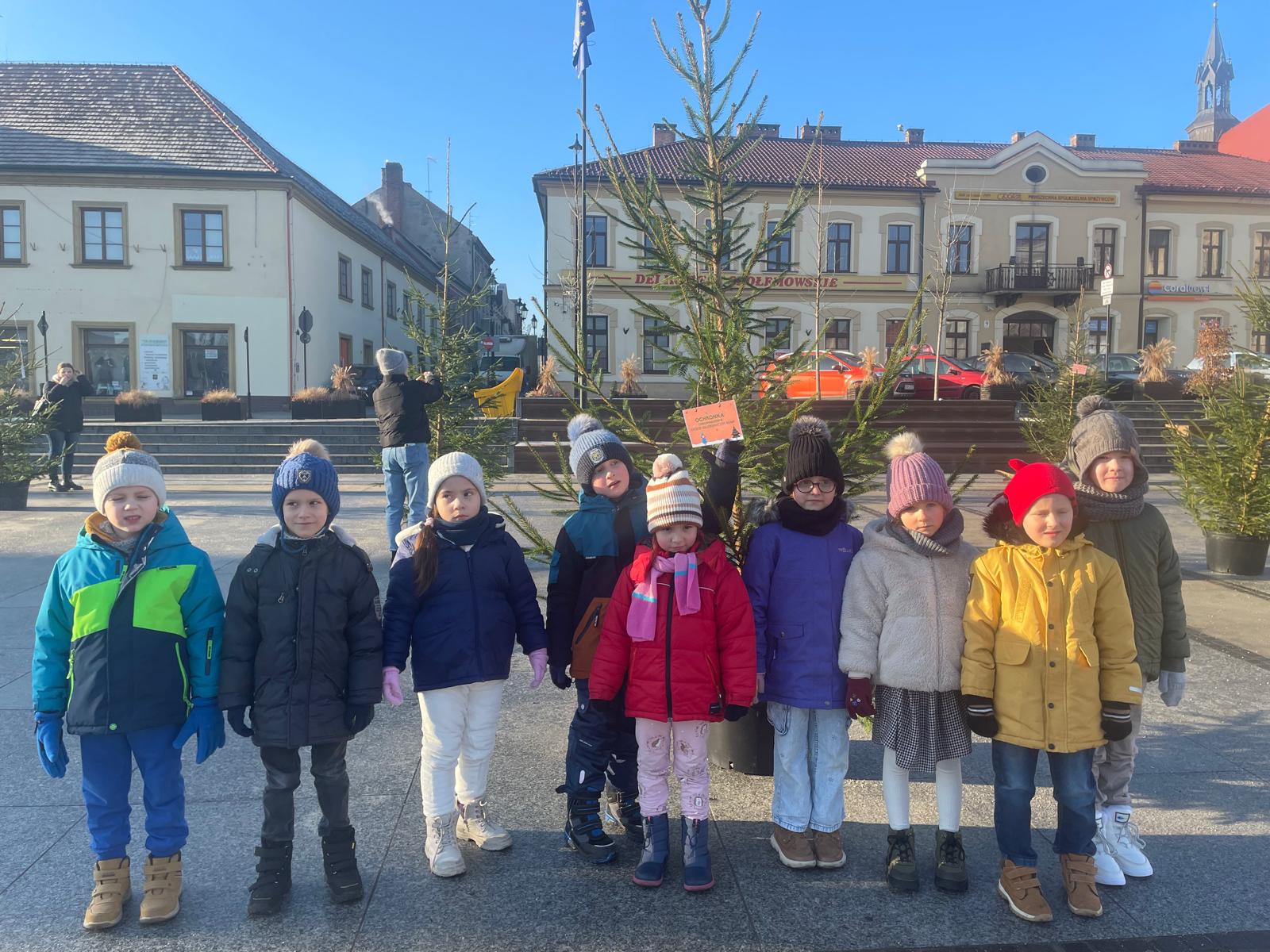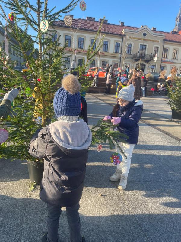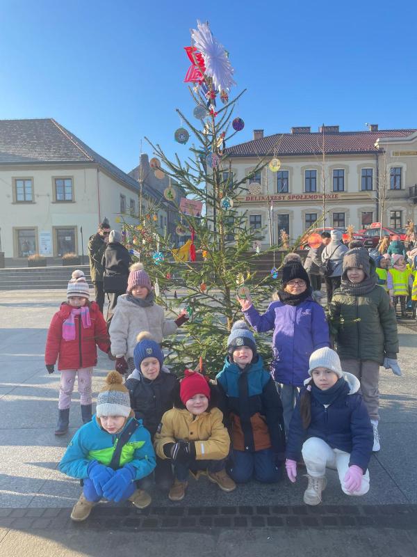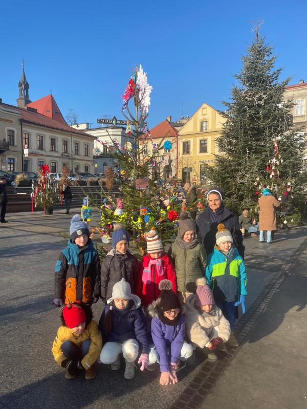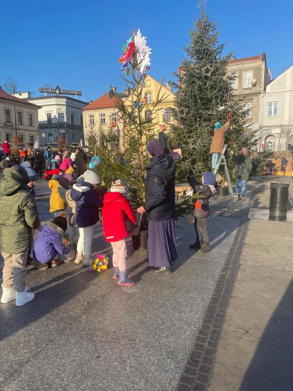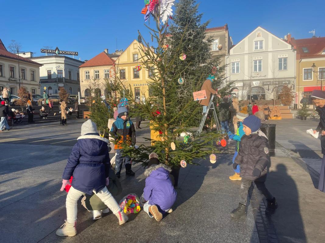W piątek, 19 grudnia, na Rynku w Bochni wyrósł prawdziwy choinkowy młodnik. Wszystko to dzięki Nadleśnictwu Brzesko – Lasy Państwowe, które przekazało piękne choinki. Drzewka zostały udekorowane przez dzieci i młodzież z miejskich przedszkoli oraz szkół, które własnoręcznie przygotowały świąteczne ozdoby. Nasze dzieci z wielkim zaangażowaniem przygotowywały świąteczne ozdoby, którymi następnie dekorowały swoją choinkę. W tym wyjątkowym wydarzeniu udział wzięła grupa zerówkowiczów, która reprezentowała naszą Ochronkę na bocheńskim Rynku. Było kolorowo, radośnie i bardzo świątecznie. O wyjątkowy nastrój tego dnia zadbały również przedszkolaki z Miejskiego Przedszkola nr 4, które zaprezentowały program artystyczny. Wspólne spotkanie wprowadziło wszystkich w magiczny klimat zbliżających się Świąt Bożego Narodzenia. Cieszymy się, że nasze dzieci mogły wziąć udział w tym pięknym, miejskim wydarzeniu i dołożyć swoją cegiełkę do świątecznego wystroju Bochni.