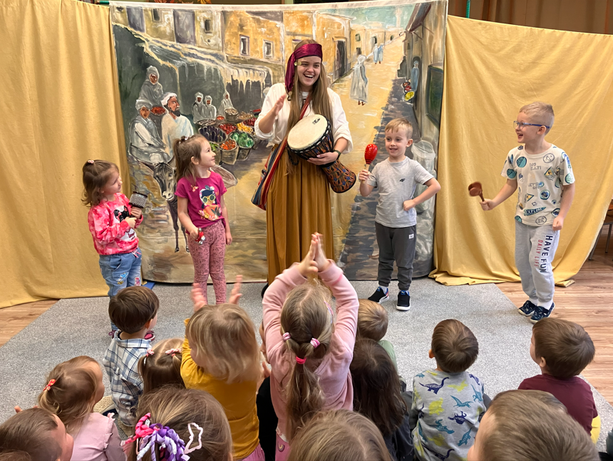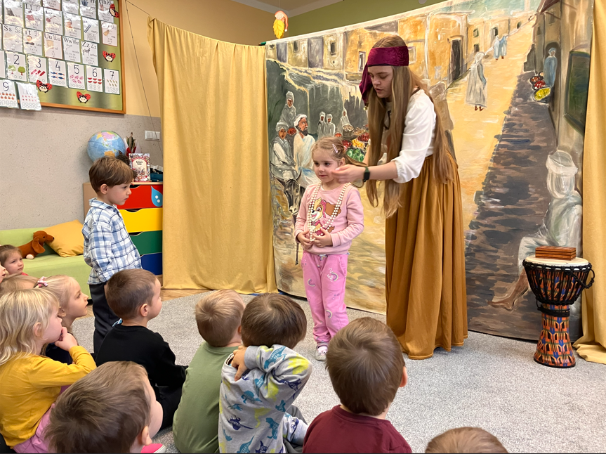 17 listopada gościliśmy w Ochronce Teatr Eden z Wieliczki. Aktorzy zaprezentowali piękne i poruszające przedstawienie pt. „Opowieść o dobrym człowieku”. Spektakl opowiadał historię handlarki, która sprzedawała drogie, cenne rzeczy. Pewnego dnia została okradziona i porzucona na pustyni, całkiem sama. Wiele osób przechodziło obok, ale nikt nie chciał jej pomóc. Dopiero jeden dobry człowiek zatrzymał się przy niej i udzielił jej pomocy i wsparcia – zupełnie bezinteresownie. To właśnie on pokazał, że prawdziwa dobroć nie oczekuje zapłaty, a serce otwarte na drugiego człowieka potrafi czynić cuda. Dzieci oglądały spektakl z ogromnym zainteresowaniem i chętnie angażowały się w udział, odpowiadając na pytania aktorów i współtworząc sceny. Przedstawienie stało się dla nich nie tylko zabawą, ale też lekcją o tym, że warto pomagać innym i być wrażliwym na potrzeby drugiego człowieka.
