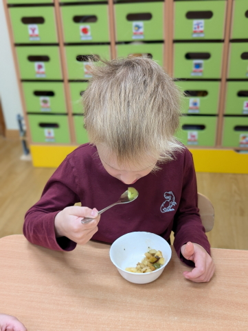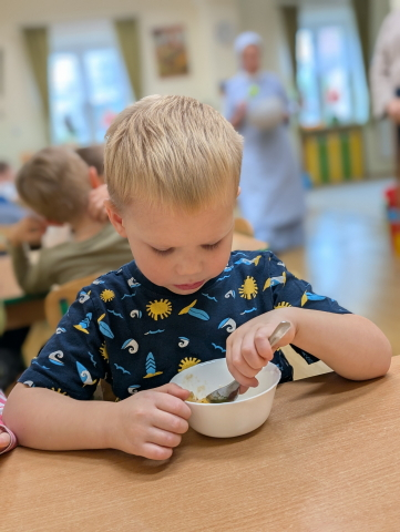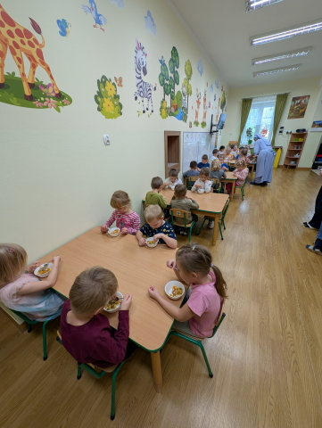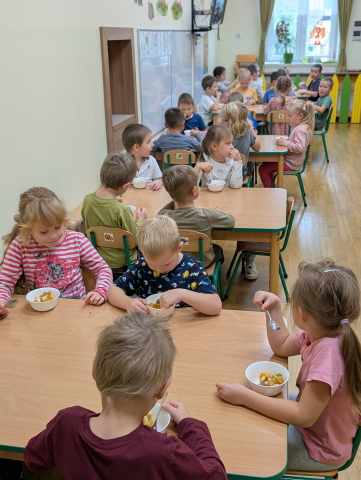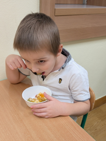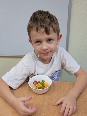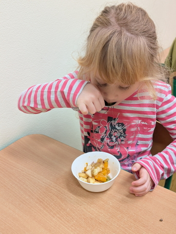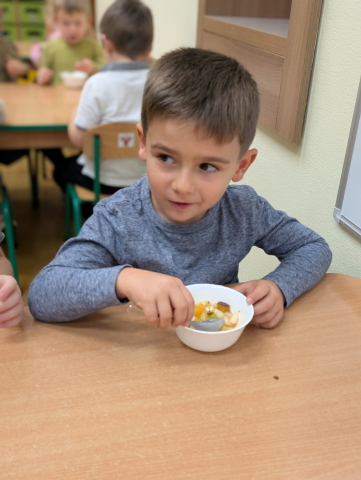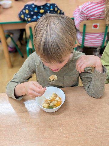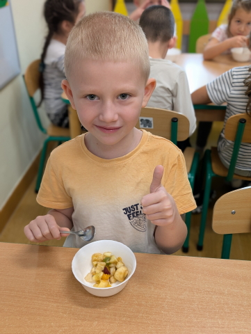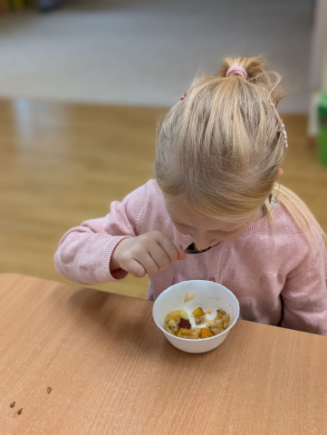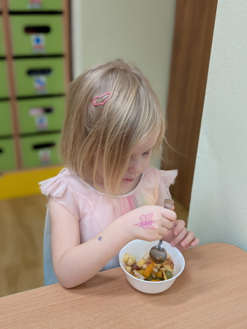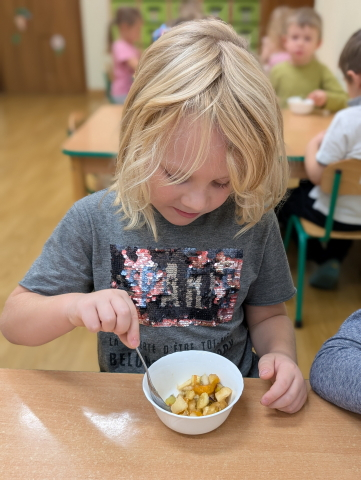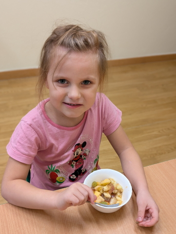 W ramach tygodnia poświęconego owocom, dzieci z grupy Biedronek przygotowały pyszną i kolorową sałatkę owocową. Każdy przyniósł ze sobą swoje ulubione owoce – było wśród nich mnóstwo smaków i kolorów: jabłka, gruszki, banany, winogrona, śliwki i wiele innych pyszności! Podczas zajęć dzieci z zapałem myły, kroiły i mieszały owoce, ucząc się współpracy i samodzielności. Wspólne przygotowanie sałatki sprawiło wszystkim wiele radości, a zapach świeżych owoców unosił się w całej sali. Kiedy sałatka była już gotowa, Biedronki z dumą poczęstowały nią młodszą grupę – Pszczółki, dzieląc się swoim zdrowym i kolorowym przysmakiem.
