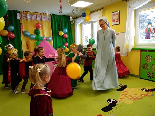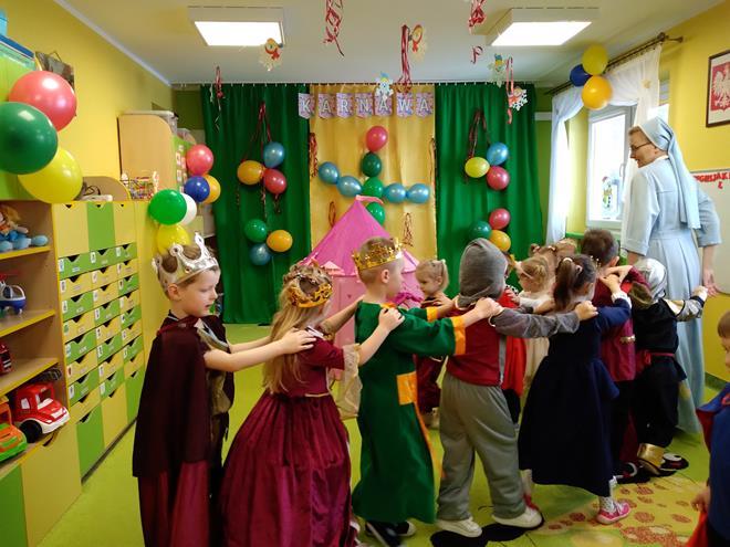 W naszej Ochronce był wyjątkowy Bal Karnawałowy. Sala ochronkowa stała się inna, jakby zamkowa. A na tej sali, Księżniczki, Królowie i Rycerze mali, radosną atmosferę stwarzali. Nikt się nie smucił, każdy był uśmiechnięty, wspólną zabawą na całego pochłonięty. A, że konkursów i tańców nie brakowało, wszyscy bardzo chcieli, by jak najdłużej to spotkanie trwało. Lecz nadszedł czas, gdy zabawie trzeba było powiedzieć, „do widzenia 😊” , teraz już pora wejść w czas wyciszenia. A jak ta nasza zabawa wyglądała, pokaże fotorelacja mała. s. Jadwiga