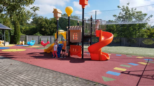 Pogoda dopisuje, więc wszystkie przedszkolaki korzystają z placu zabaw. Wszystkie grupy wspólnie bawią się, a jednocześnie poznają się wzajemnie. Starsi służą pomocą młodszym, młodsi korzystają chętnie z tej pomocy.