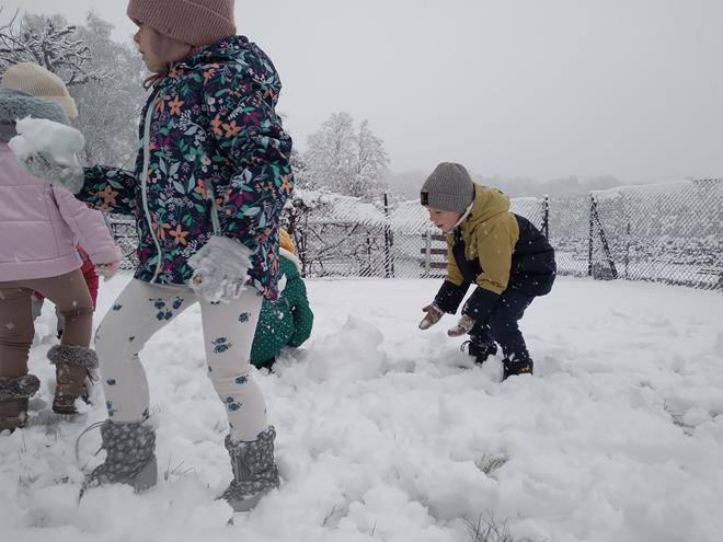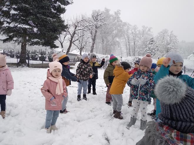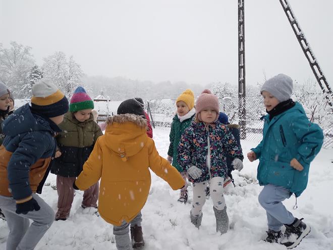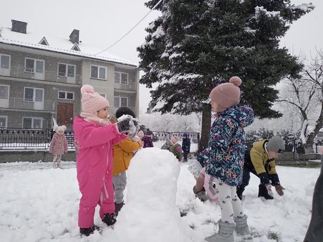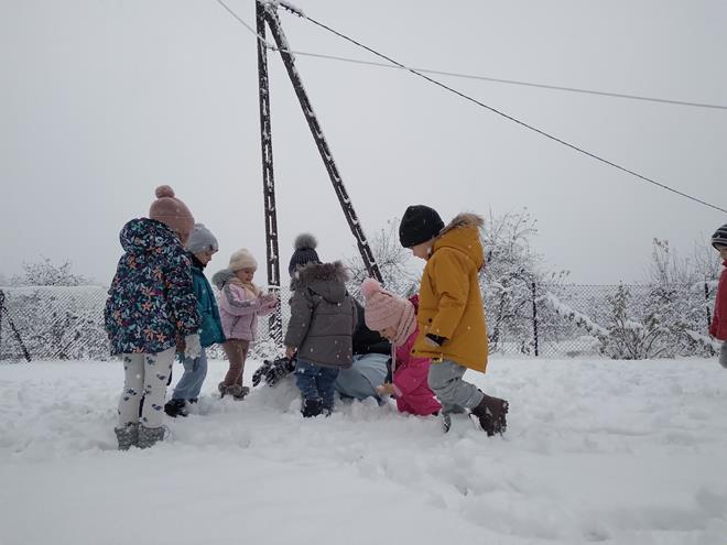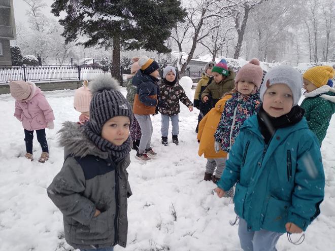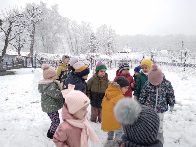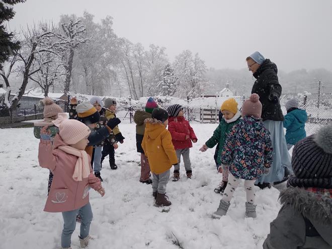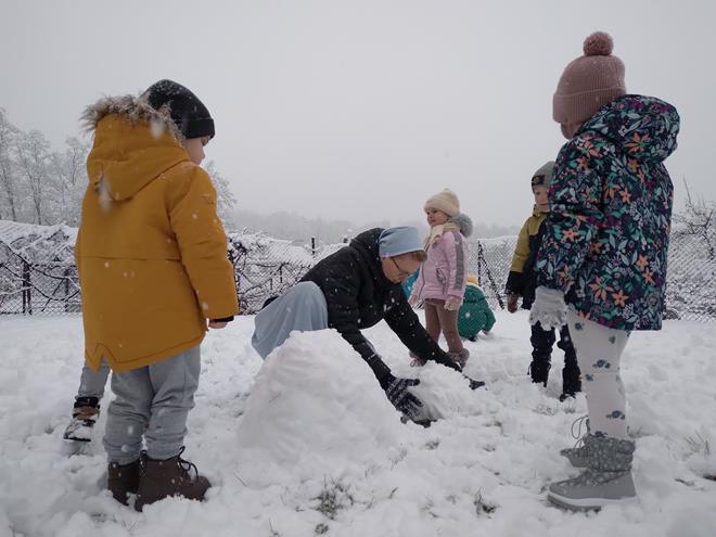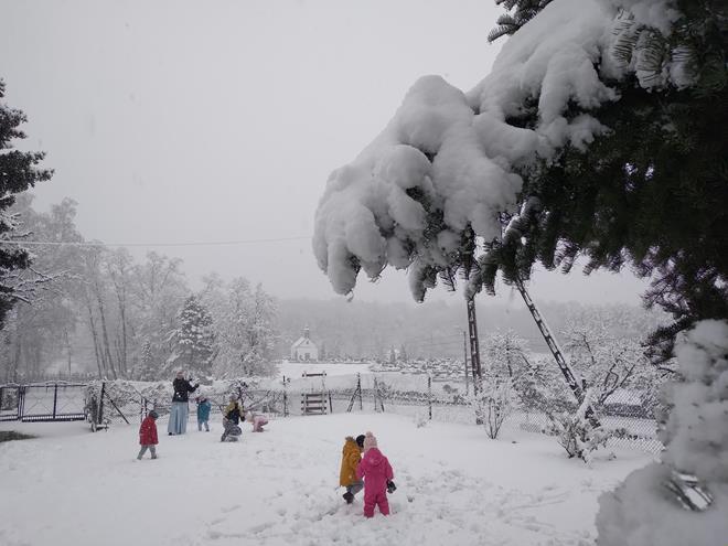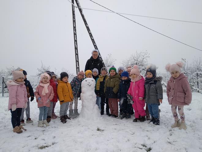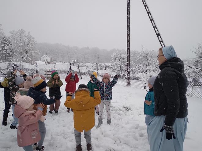 Spadł długo oczekiwany przez naszych przedszkolaków „pierwszy” śnieg. I właśnie to było powodem wielkiej radości, jaka panowała dziś w naszej Ochronce. Od samego rana wszystkie dzieci, te młodsze i te trochę starsze wpatrywały się w okno z pytaniem na ustach „Czy pójdziemy pobawić się na śniegu?”. I tak też się stało. A chociaż strój nie do końca był odpowiedni na takie śniegowe szaleństwo, to i tak każdemu udało się pobawić w „białym puchu”, a nawet wspólnie ulepić bałwanka. s. Jadwiga