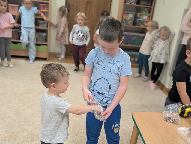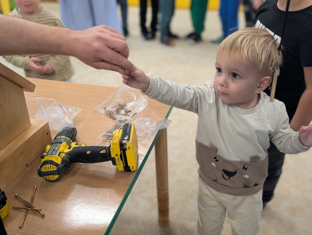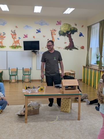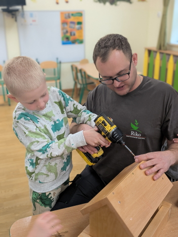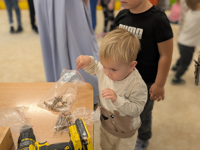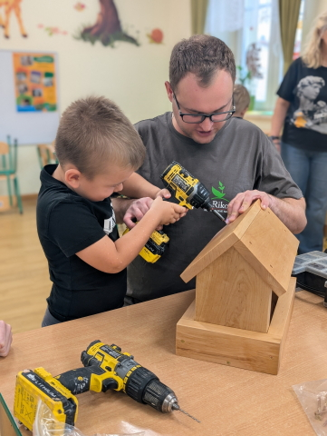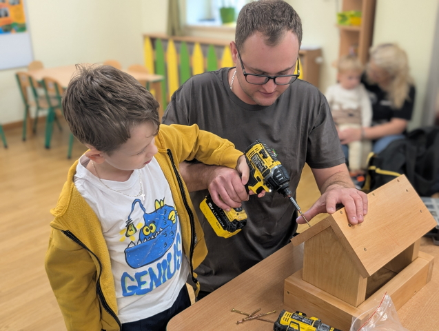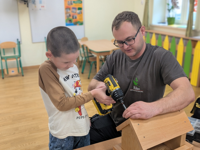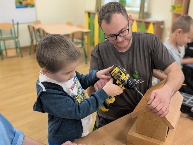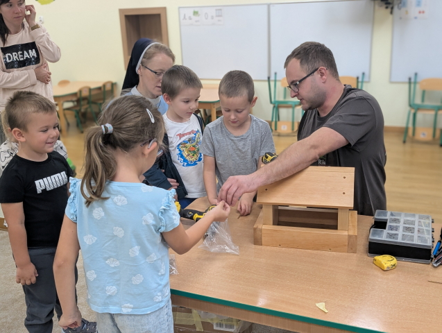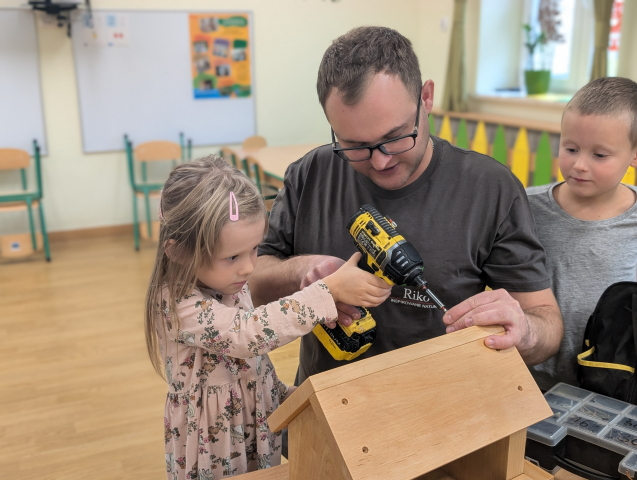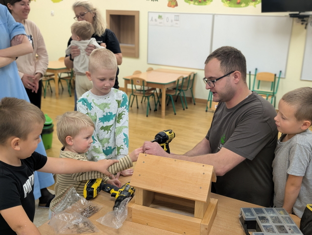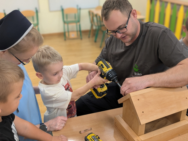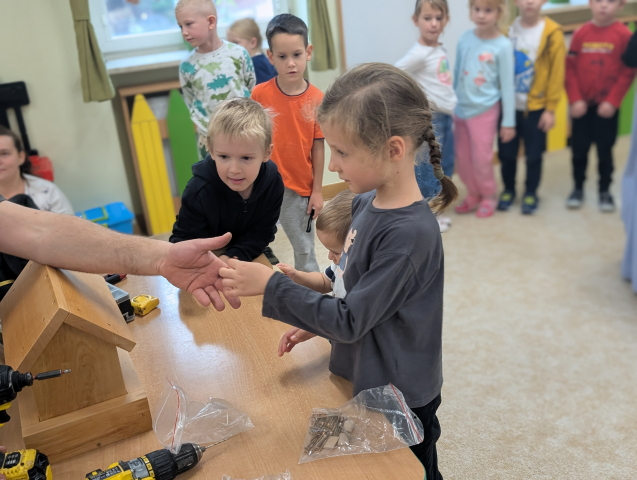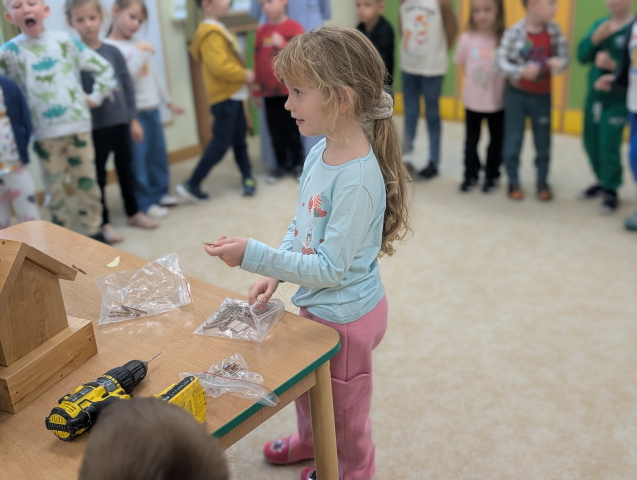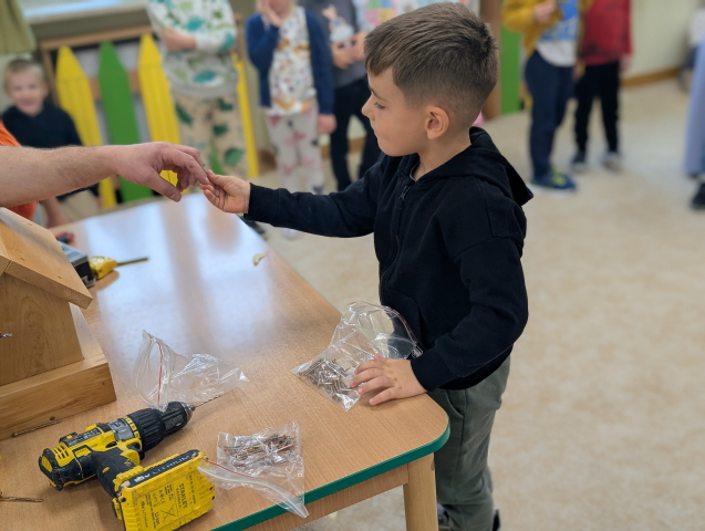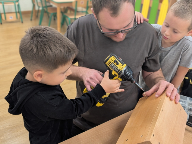 W ramach cyklu „Poznajemy zawody naszych rodziców” odwiedził nas pan Kamil Łącki – tata Radzia i Mirusia, który z ogromną pasją opowiadał o swojej pracy stolarza. Podczas spotkania dzieci dowiedziały się, jak powstają meble i różne drewniane przedmioty, jakich narzędzi używa się w warsztacie oraz jak ważna jest precyzja, cierpliwość i wyobraźnia w tym zawodzie. Najwięcej radości sprawiła dzieciom część praktyczna – wspólne budowanie drewnianego domku, w której każde dziecko mogło pomóc i przekonać się, jak z kawałków drewna powstaje coś wyjątkowego. Na zakończenie pan Kamil przygotował dla każdego przedszkolaka drobny, własnoręcznie wykonany upominek – listek, kwiatuszek lub serduszko z drewna, a także słodkiego cukierka. Dzieci były zachwycone i z dumą oglądały małe dzieła sztuki stworzone przez naszego gościa.