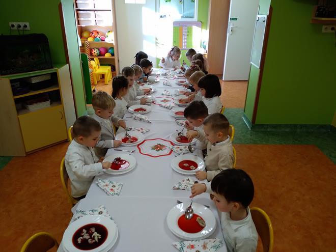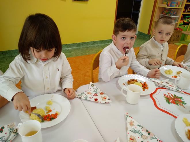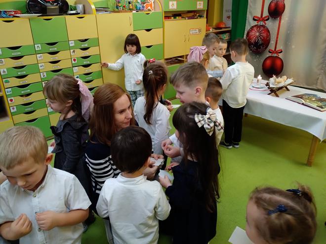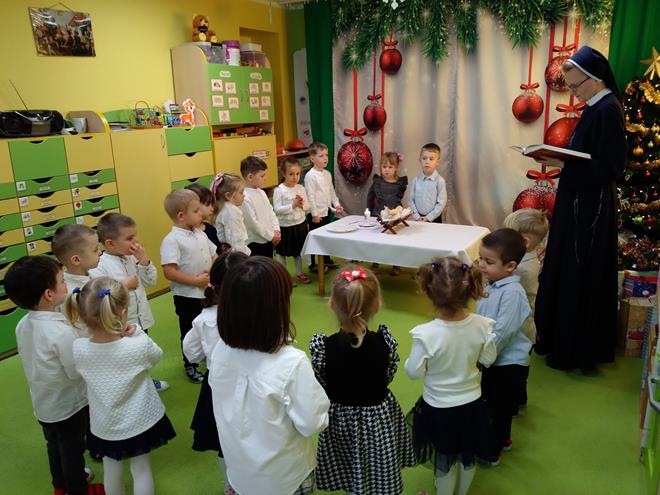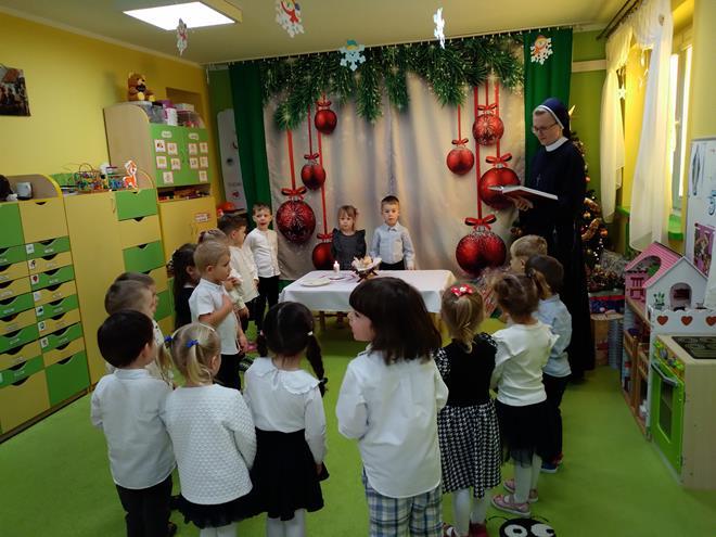 Wigilia Bożego Narodzenia to jeden z najpiękniejszych dni w roku, na który czekamy i przeżywamy go uroczyście. Tak było i w tym roku. Przedszkolaki oraz cały personel zebrali się wspólnie, aby wysłuchać historii narodzenia Pana Jezusa, połamać się opłatkiem, złożyć serdeczne życzenia, śpiewać kolędy oraz zjeść uroczysty obiad. W dzień Wigilii w naszej Ochronce panowała radosna, ożywiona atmosfera. Świąteczne dekoracje oraz dzieci w odświętnych strojach wprowadziły nastrój oczekiwania na Święta Bożego Narodzenia. s.Jadwiga