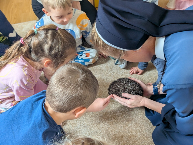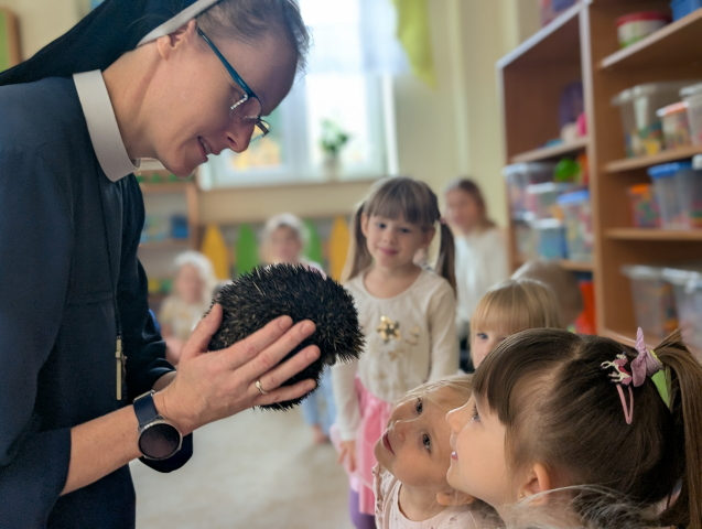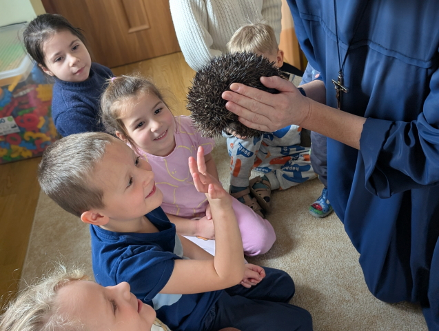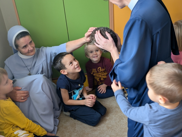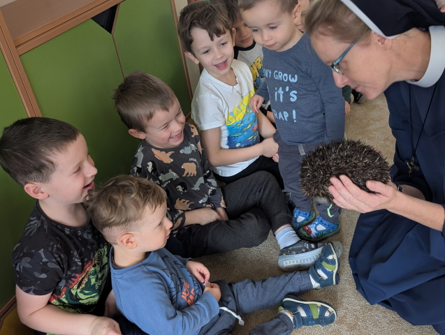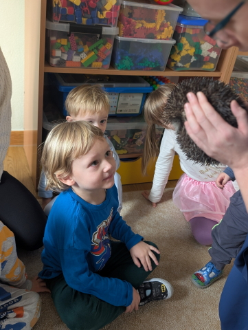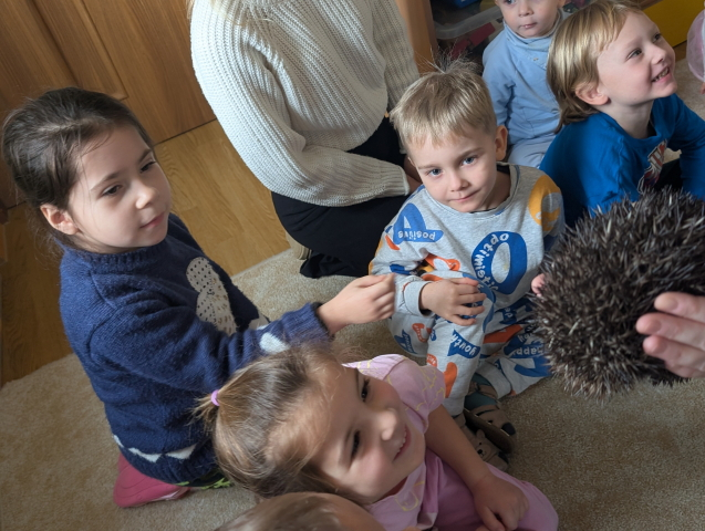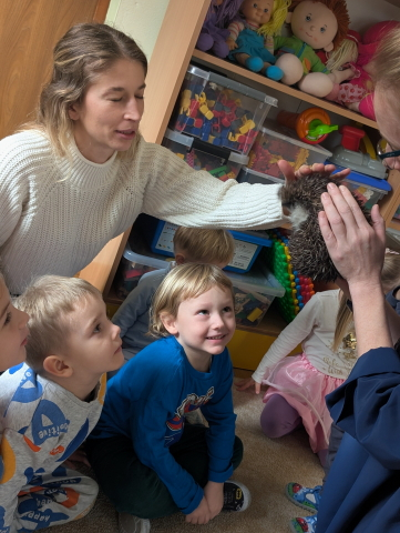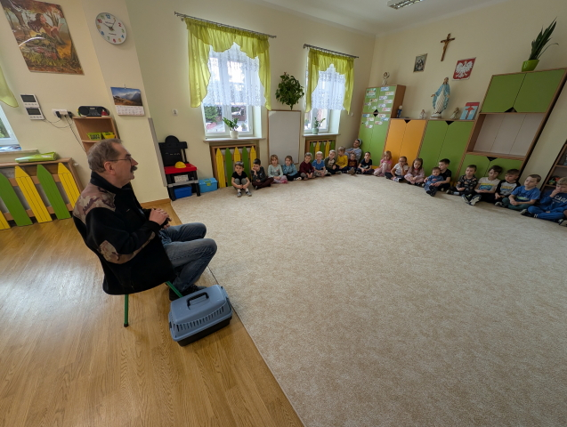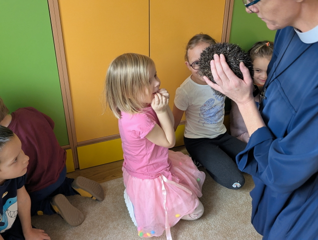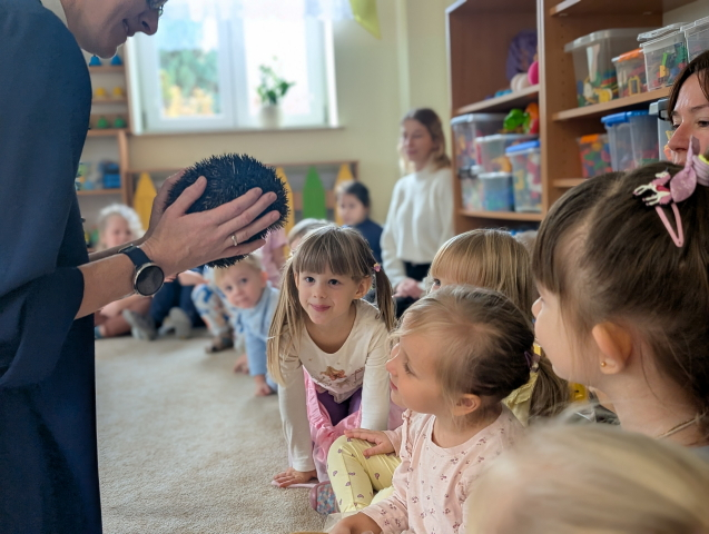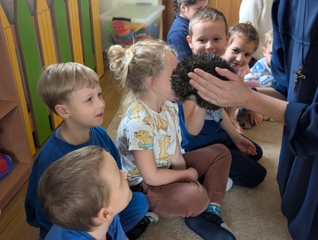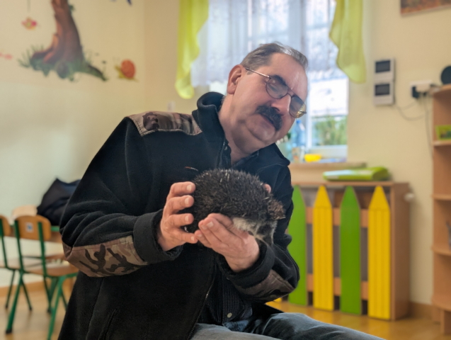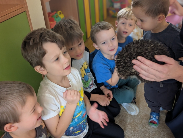 Naszą Ochronkę odwiedził Pan Witold – niezwykła osoba, która z pasją i ogromnym sercem opiekuje się jeżami. Na spotkanie przywiózł aż trzech swoich podopiecznych: Zdzisia, Agniesię i Janinkę. Dzieci były zachwycone możliwością poznania tych małych, kolczastych gości z tak bliska. Podczas zajęć Pan Witold opowiedział przedszkolakom mnóstwo ciekawostek o życiu jeży – o tym, gdzie mieszkają, co jedzą, jak się bronią i dlaczego tak ważna jest pomoc tym, które nie poradziłyby sobie w zimowych warunkach. Dzieci z ogromnym zainteresowaniem słuchały, a największą radość sprawiła im możliwość dotknięcia i pogłaskania przywiezionych jeży, oczywiście pod czujnym okiem naszego gościa. Pan Witold zajmuje się jeżami z pełnym oddaniem – pomaga tym, które nie przetrwałyby zimy, a kiedy tylko stają się silniejsze, wypuszcza je z powrotem na wolność. Widać, że to prawdziwa pasja, w którą wkłada całe serce. Serdecznie dziękujemy Panu Witoldowi za poświęcony czas, zaangażowanie i niezwykle ciekawą opowieść o swoich małych podopiecznych. Spotkanie było dla dzieci wyjątkową okazją, by poznać świat przyrody z zupełnie nowej perspektywy.