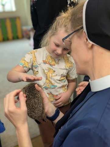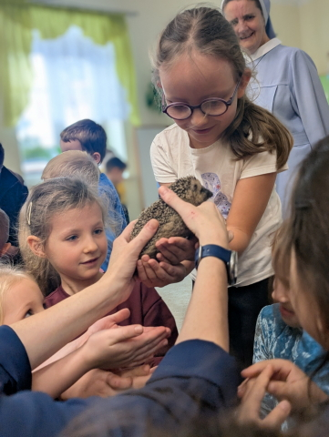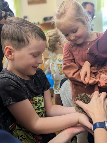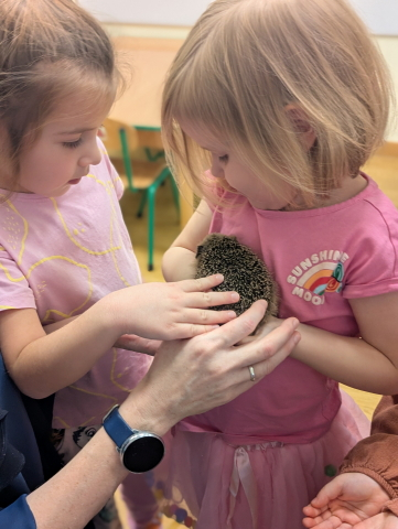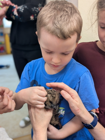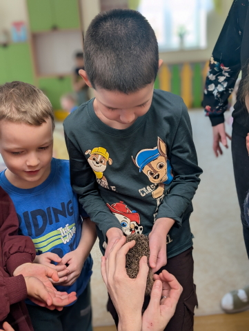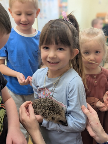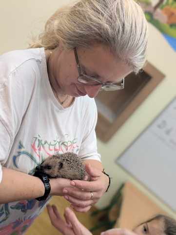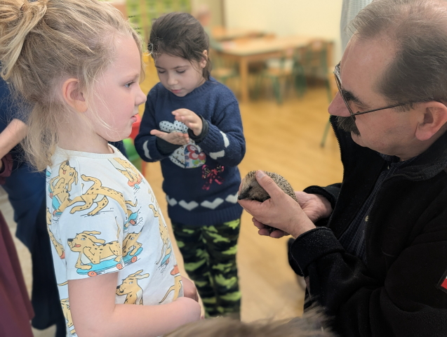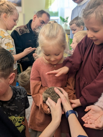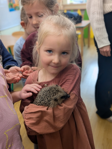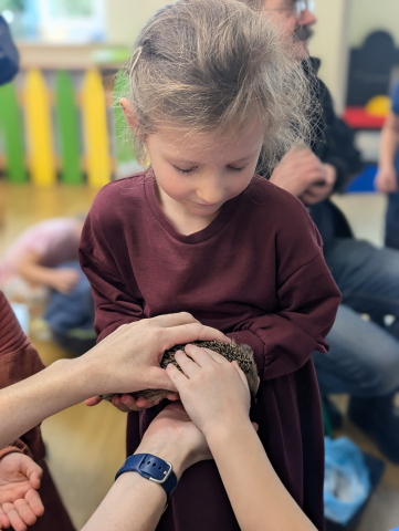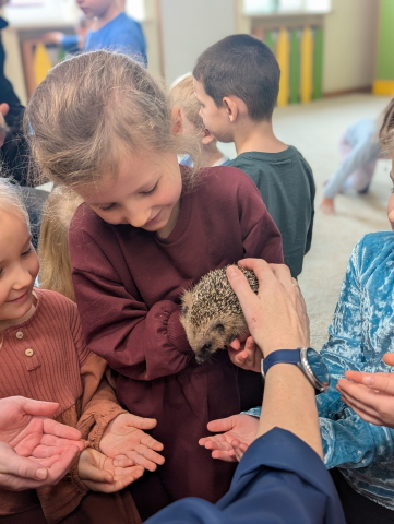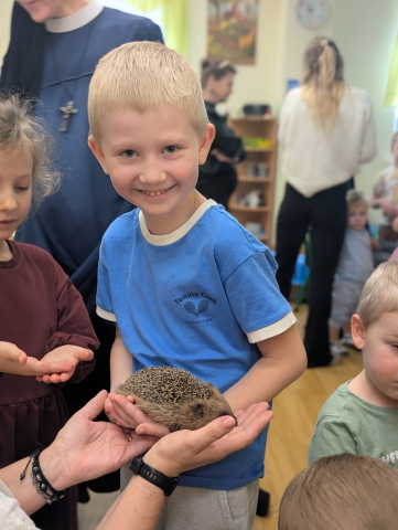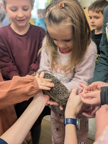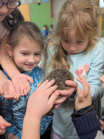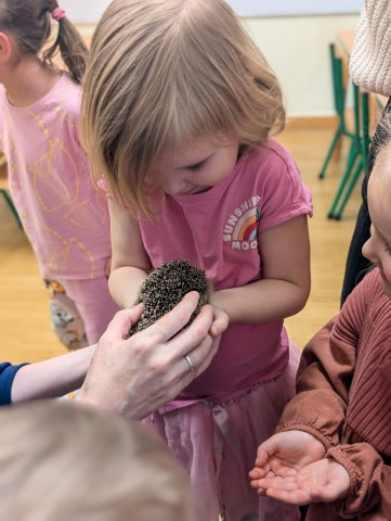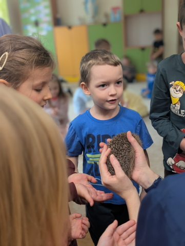 Naszą Ochronkę odwiedził Pan Witold – niezwykła osoba, która z pasją i ogromnym sercem opiekuje się jeżami. Na spotkanie przywiózł aż trzech swoich podopiecznych: Zdzisia, Agniesię i Janinkę. Dzieci były zachwycone możliwością poznania tych małych, kolczastych gości z tak bliska. Podczas zajęć Pan Witold opowiedział przedszkolakom mnóstwo ciekawostek o życiu jeży – o tym, gdzie mieszkają, co jedzą, jak się bronią i dlaczego tak ważna jest pomoc tym, które nie poradziłyby sobie w zimowych warunkach. Dzieci z ogromnym zainteresowaniem słuchały, a największą radość sprawiła im możliwość dotknięcia i pogłaskania przywiezionych jeży, oczywiście pod czujnym okiem naszego gościa. Pan Witold zajmuje się jeżami z pełnym oddaniem – pomaga tym, które nie przetrwałyby zimy, a kiedy tylko stają się silniejsze, wypuszcza je z powrotem na wolność. Widać, że to prawdziwa pasja, w którą wkłada całe serce. Serdecznie dziękujemy Panu Witoldowi za poświęcony czas, zaangażowanie i niezwykle ciekawą opowieść o swoich małych podopiecznych. Spotkanie było dla dzieci wyjątkową okazją, by poznać świat przyrody z zupełnie nowej perspektywy.