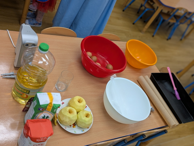 W ramach tygodnia poświęconego owocom, nasza najmłodsza grupa – Pszczółki, zamieniła się w małych kucharzy i wspólnie upiekła pyszne kakaowe ciasto z jabłkami. Podczas zajęć każdy miał swoje zadanie – dzieci odmierzały składniki, wsypywały mąkę, cukier, kakao, dodawały pokrojone jabłka i z ciekawością obserwowały, jak z prostych składników powstaje coś wyjątkowego. W powietrzu unosił się cudowny zapach pieczonego ciasta, który przyciągnął wszystkich do kuchni!