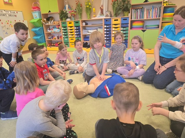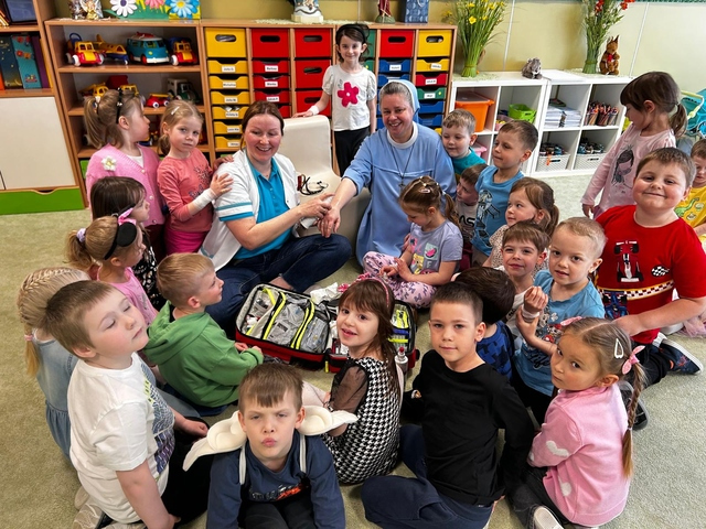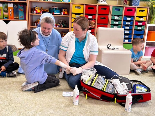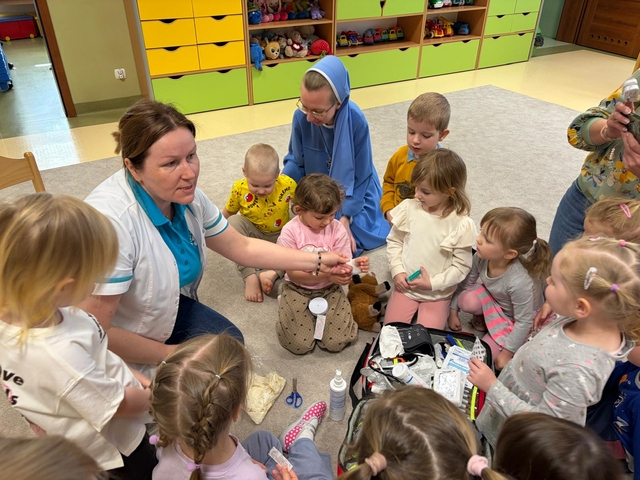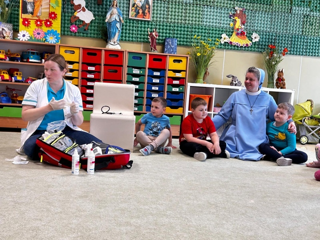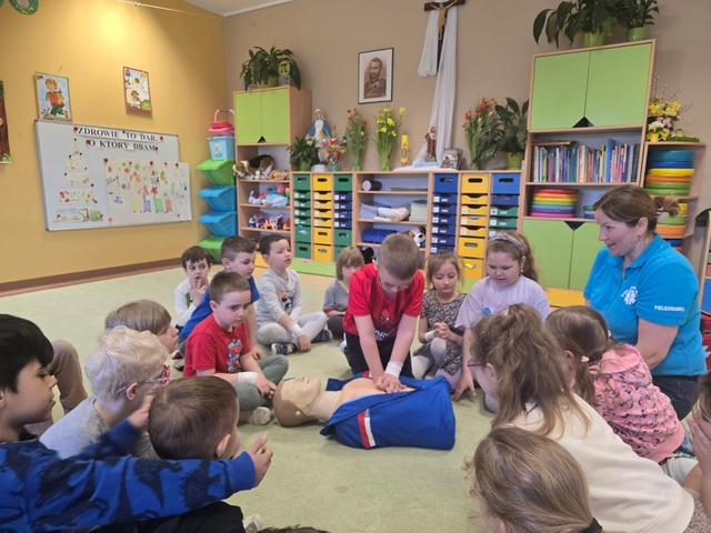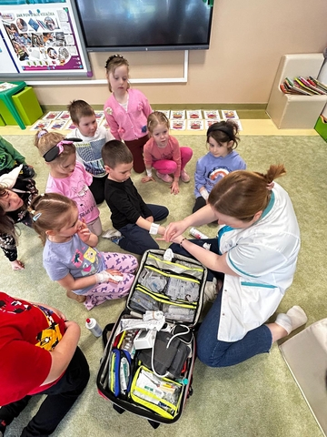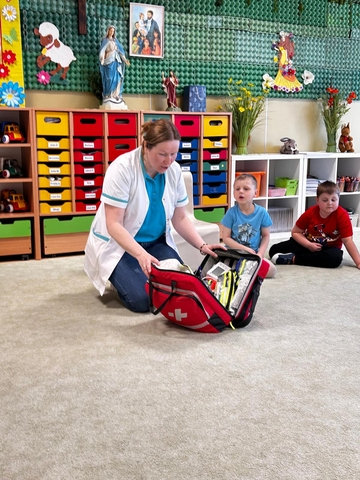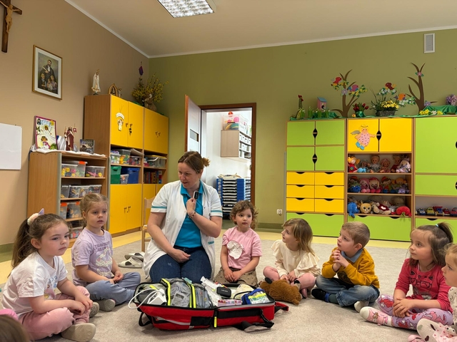 21 kwietnia w naszej Ochronce odbyÅ‚o siÄ™ wyjÄ…tkowe spotkanie z paniÄ… EwelinÄ… – pielÄ™gniarkÄ… i mamÄ… naszej Jagody z grupy Pszczółki. Pani Ewelina odwiedziÅ‚a wszystkie grupy, opowiadajÄ…c dzieciom o swojej pracy i pokazujÄ…c, jak udzielać pierwszej pomocy.
