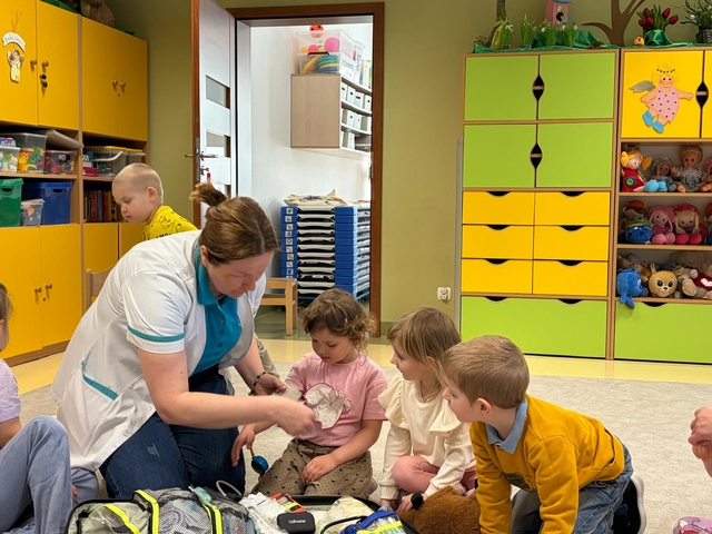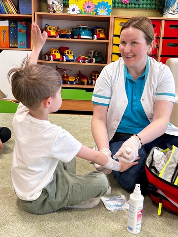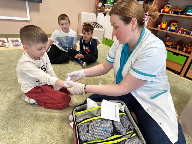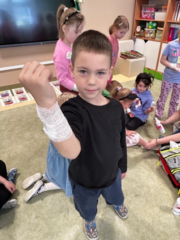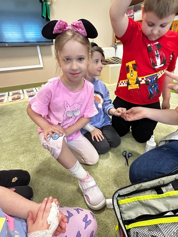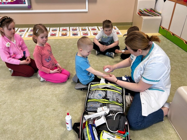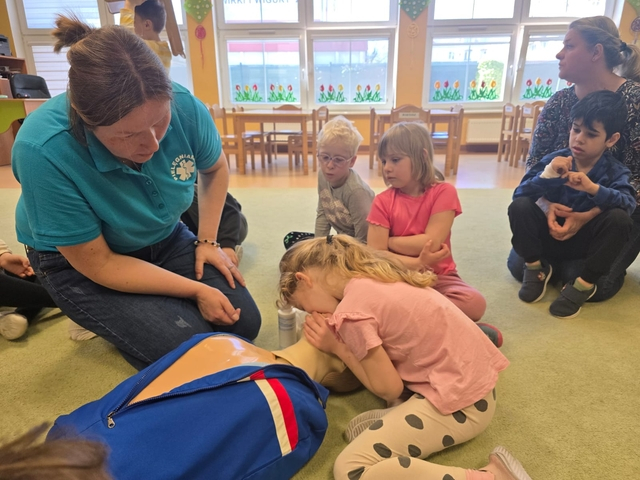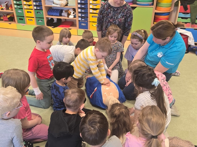 NajwiÄ™cej radoÅ›ci sprawiÅ‚y przedszkolakom praktyczne ćwiczenia – klejenie plasterków i bandażowanie rÄ…k, czyli to, co zrobić, gdy pojawi siÄ™ skaleczenie. Starsze dzieci z grupy Motylki miaÅ‚y również okazjÄ™ spróbować swoich siÅ‚ podczas ćwiczeÅ„ pierwszej pomocy na fantomie.