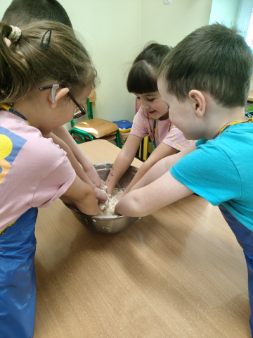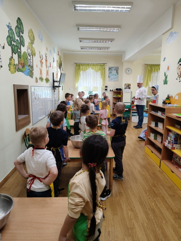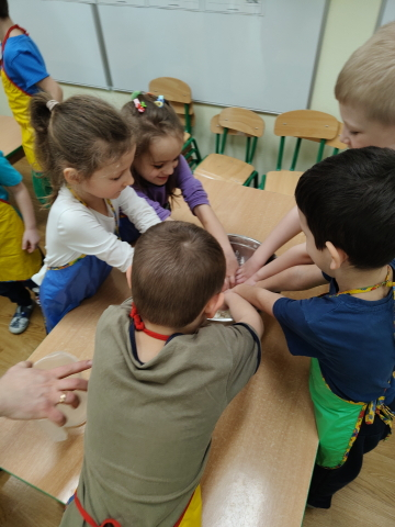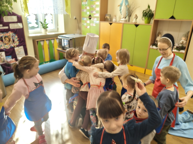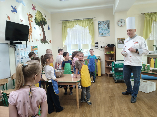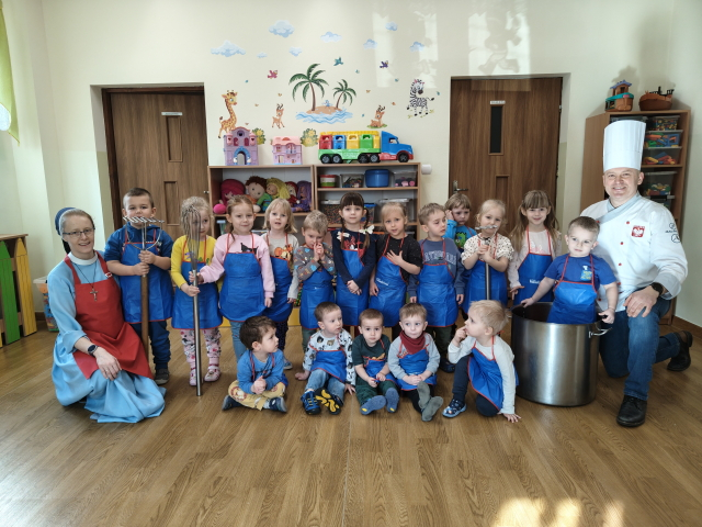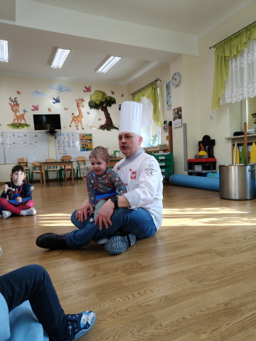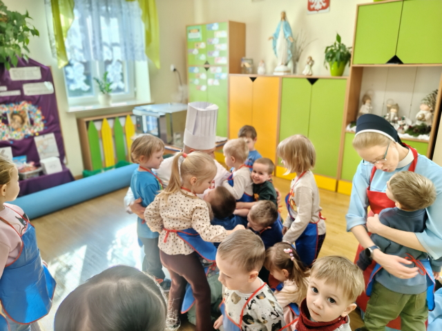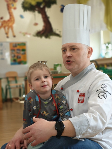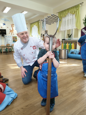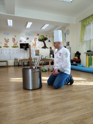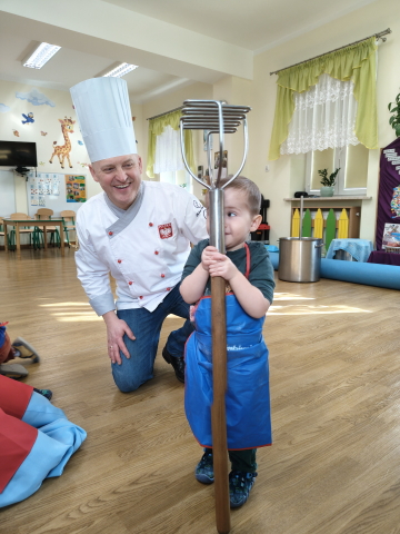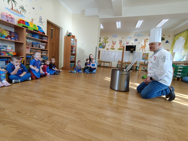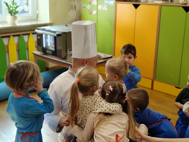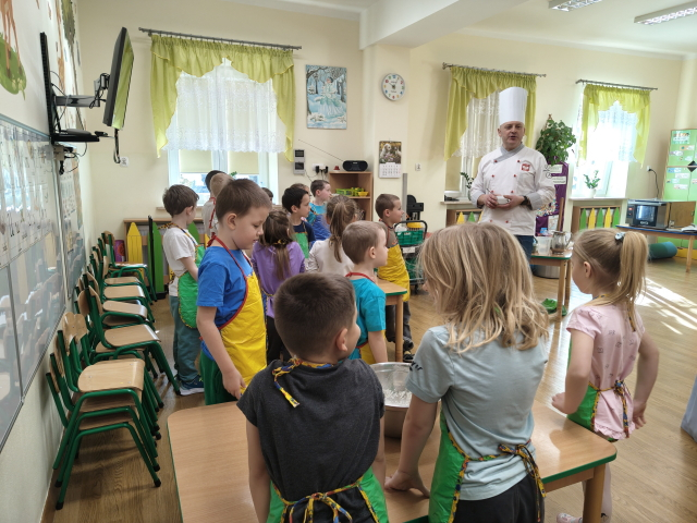 W naszej Ochronce odbyły się wyjątkowe warsztaty kulinarne z panem Łukaszem Grabowskim, który jest kucharzem. Dzieci miały okazję poczuć się jak prawdziwi mali kucharze i samodzielnie przygotować swoją pizzę. Najpierw przedszkolaki zarabiały ciasto, poznając podstawy jego przygotowania. Następnie każdy mógł skomponować swoją pizzę, wybierając ulubione dodatki i układając je według własnego pomysłu. Na końcu pan Łukasz wypiekał przygotowane pizze, a w sali szybko rozniósł się apetyczny zapach. W trakcie warsztatów nasz gość opowiadał także o swojej pracy i pokazywał różne przybory kuchenne, których używa na co dzień. Dzieci z zainteresowaniem słuchały, jak wygląda gotowanie dla bardzo dużej liczby osób – nawet dla 300 osób. Nasi najmłodsi poznali również historię pizzy i jej poszczególnych nazw.