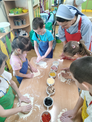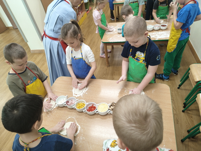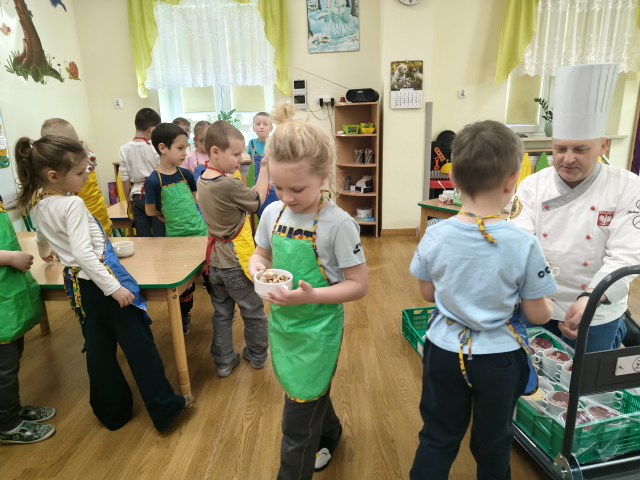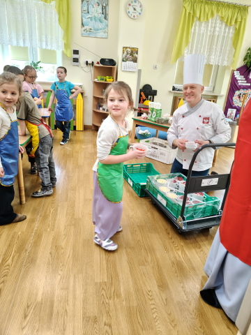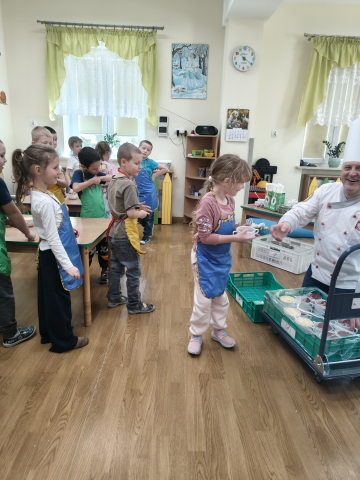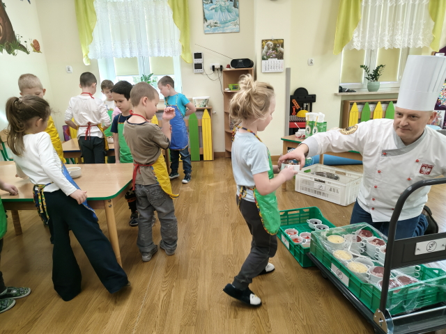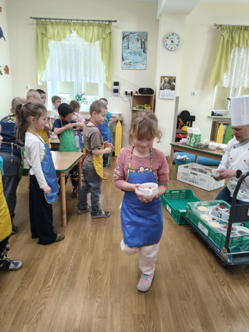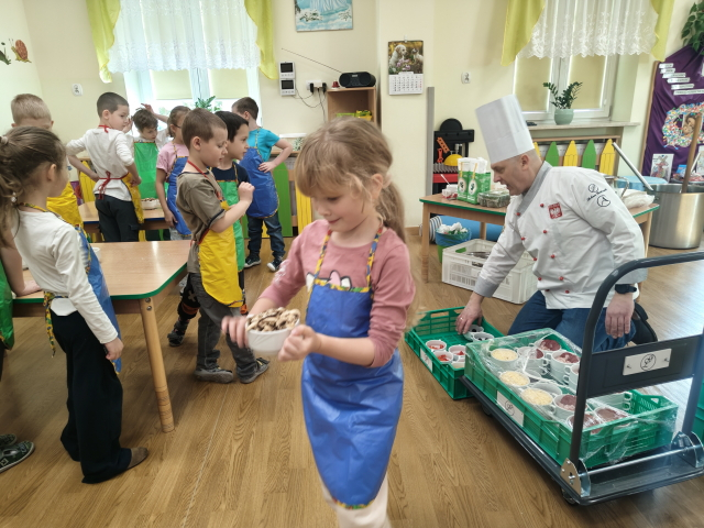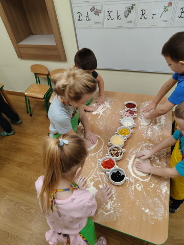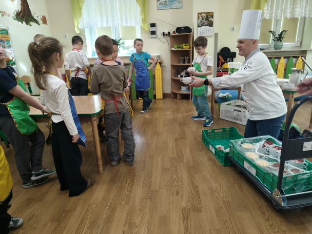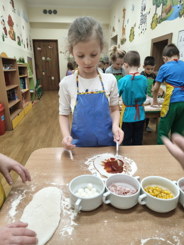 W naszej Ochronce odbyły się wyjątkowe warsztaty kulinarne z panem Łukaszem Grabowskim, który jest kucharzem. Dzieci miały okazję poczuć się jak prawdziwi mali kucharze i samodzielnie przygotować swoją pizzę. Najpierw przedszkolaki zarabiały ciasto, poznając podstawy jego przygotowania. Następnie każdy mógł skomponować swoją pizzę, wybierając ulubione dodatki i układając je według własnego pomysłu. Na końcu pan Łukasz wypiekał przygotowane pizze, a w sali szybko rozniósł się apetyczny zapach. W trakcie warsztatów nasz gość opowiadał także o swojej pracy i pokazywał różne przybory kuchenne, których używa na co dzień. Dzieci z zainteresowaniem słuchały, jak wygląda gotowanie dla bardzo dużej liczby osób – nawet dla 300 osób. Nasi najmłodsi poznali również historię pizzy i jej poszczególnych nazw.