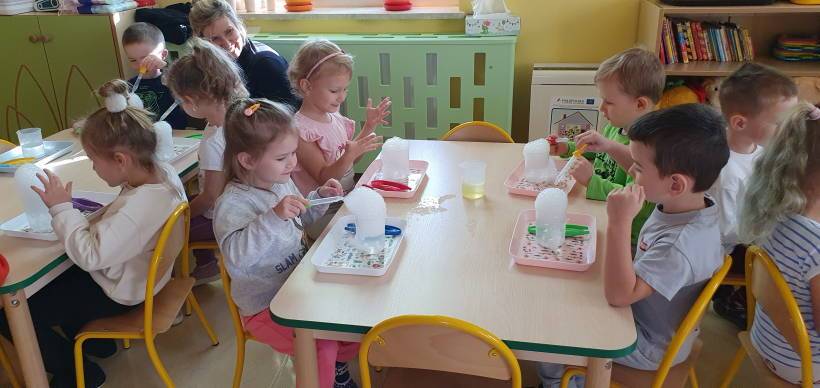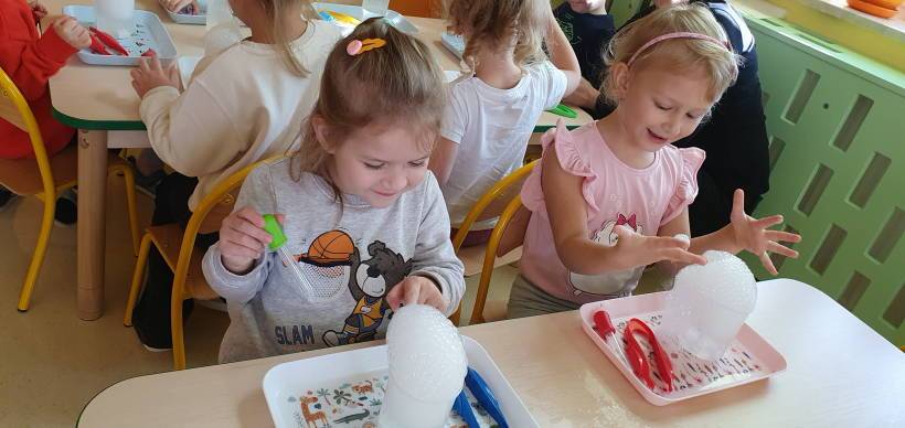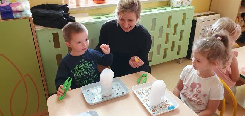 Kolejne zajęcia z Ani – Mani – animator zabaw dla dzieci były poświęcone tajemnicy suchego lodu. Podczas fascynujących doświadczeń, które łączyły naukę z dobrą zabawą, dzieci obserwowały jak suchy lód w kontakcie z wodą tworzy „dymiące” chmurki, bąbelki i mgłę. Była również okazja do eksperymentowania, co dostarczyło dzieciom wielu wrażeń.