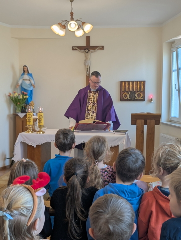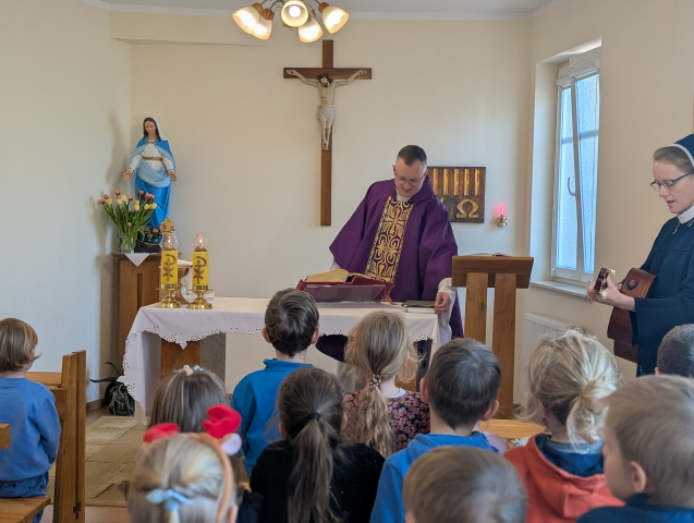 Okres Wielkiego Postu, to szczególny czas wyciszenia, refleksji oraz przygotowania serc na Święta Wielkanocne. W tym duchu uczestniczyliśmy we Mszy Świętej, która odbyła się w kaplicy Sióstr. Eucharystii przewodniczył ks. Jakub Piekielny. Dzieci aktywnie włączyły się w przeżywanie liturgii, szczególnie poprzez śpiew pieśni wielkopostnych. Był to dla nas wszystkich ważny moment wspólnego zatrzymania się i przeżywania tego wyjątkowego czasu. Serdecznie dziękujemy ks. Jakubowi Piekielnemu za wspólną modlitwę i obecność.