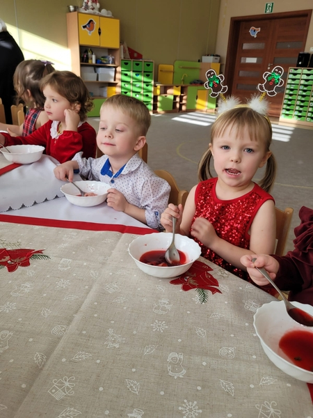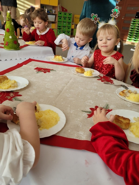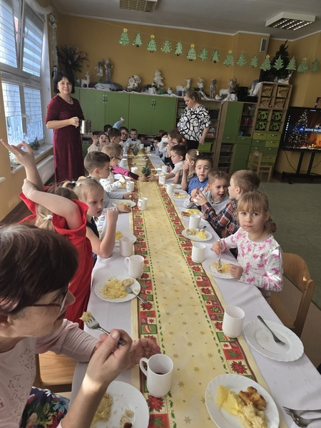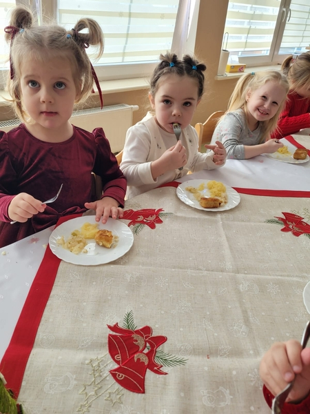 Po wspólnym świętowaniu każda grupa udała się do swojej sali, by przy wigilijnym stole, przy blasku lampek i dźwiękach kolęd, zjeść świąteczny posiłek. To był piękny czas pełen serdeczności, uśmiechów i ciepła – idealne zakończenie roku w naszej przedszkolnej wspólnocie.