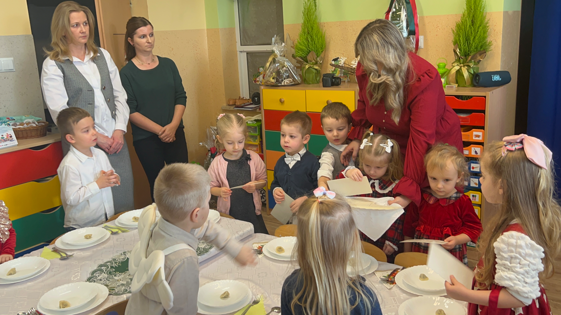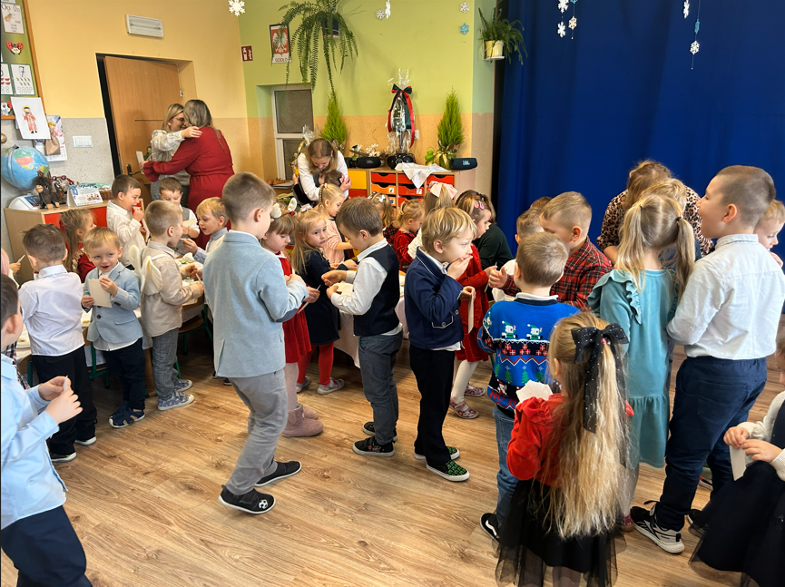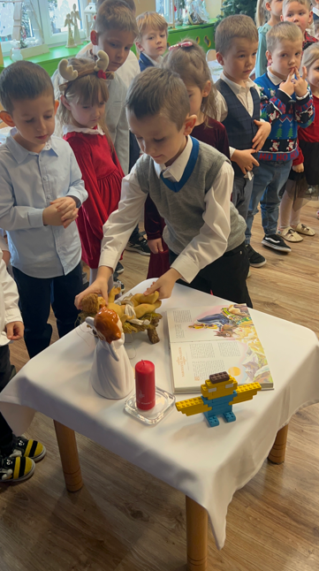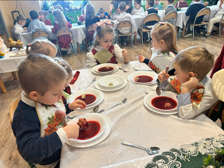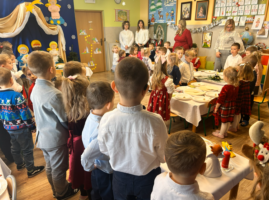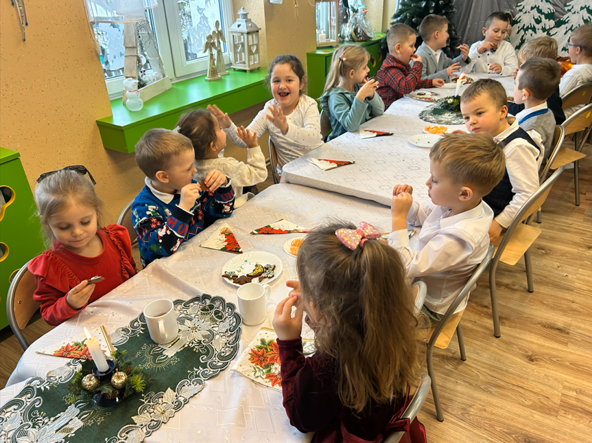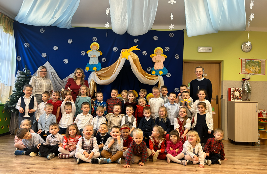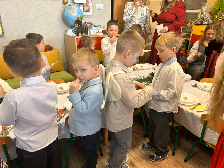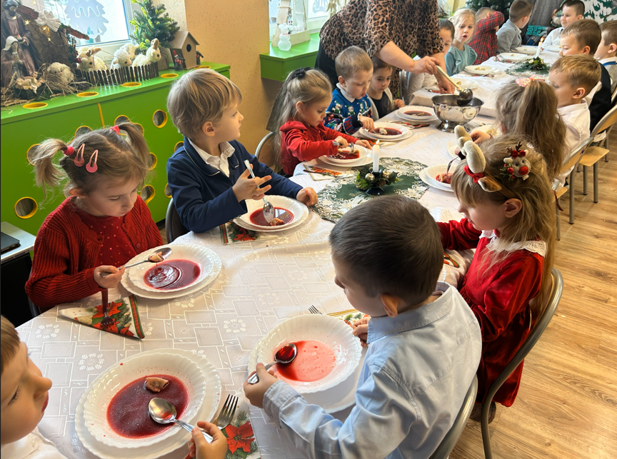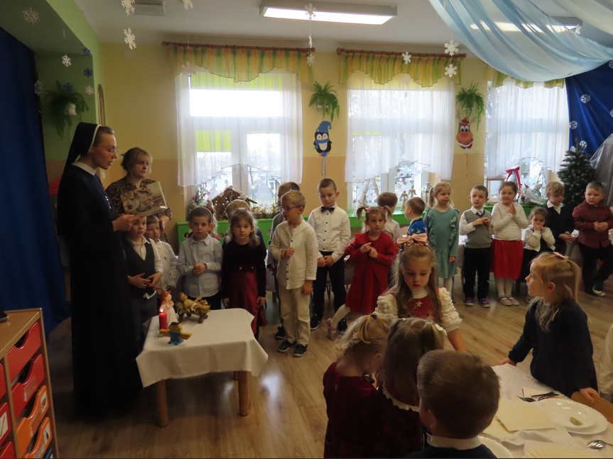 19 grudnia nasza Ochronka wypełniła się wyjątkową, świąteczną atmosferą. Dzieci przyszły ubrane w odświętne stroje, a od rana towarzyszyła nam radość wspólnego przygotowywania się do Wigilii. Starsza grupa nakrywała wigilijny stół – rozkładała obrusy, serwetki i świeczniki, natomiast młodsze dzieci z radością ubierały choinkę. Ważnym momentem było wspólne zgromadzenie się przy stole. W tym wyjątkowym dniu towarzyszyli nam przedstawiciele Rady Rodziców, którzy w imieniu wszystkich rodziców złożyli Siostrze Dyrektor, paniom oraz dzieciom serdeczne życzenia świąteczne. Wyrazem wdzięczności był także piękny, własnoręcznie wykonany prezent – pełen serca, czasu i oddania. Podczas kolędy „Wśród nocnej ciszy” jedno z dzieci niosło figurkę małego Jezusa, którą złożyło w żłóbku. Zapalona świeca, fragment Pisma Świętego odczytany przez s. Dyrektor oraz wspólne łamanie się opłatkiem stworzyły atmosferę bliskości i prawdziwego rodzinnego ciepła. Po modlitwie zasiedliśmy razem do wigilijnego stołu, a po posiłku dzieci radośnie śpiewały kolędy, oddając chwałę Dzieciątku Jezus.
