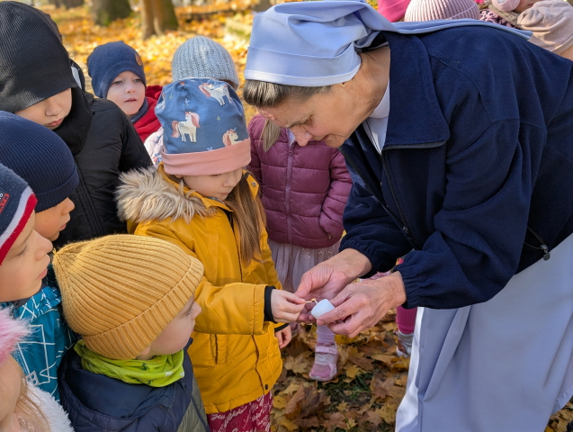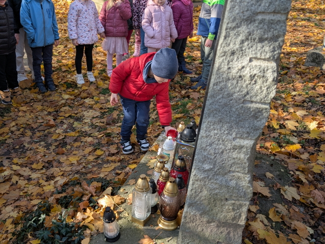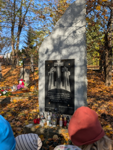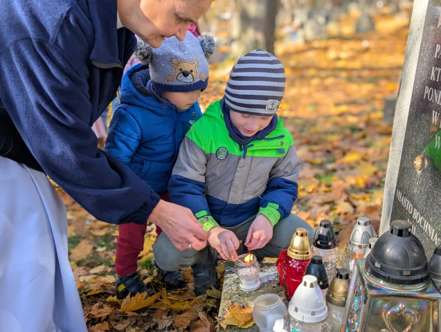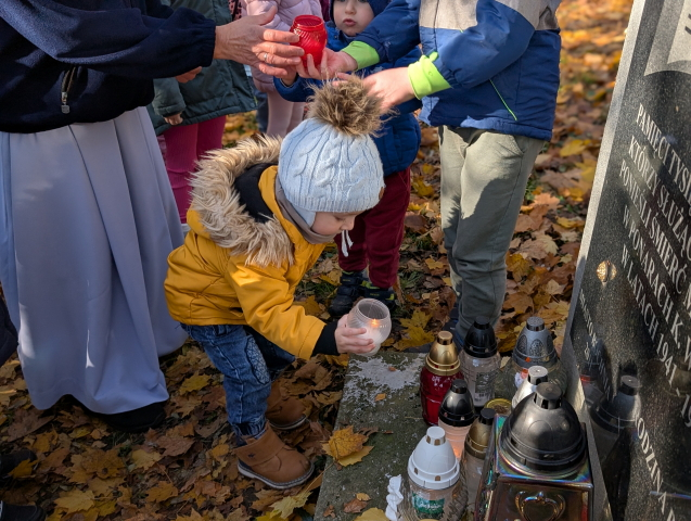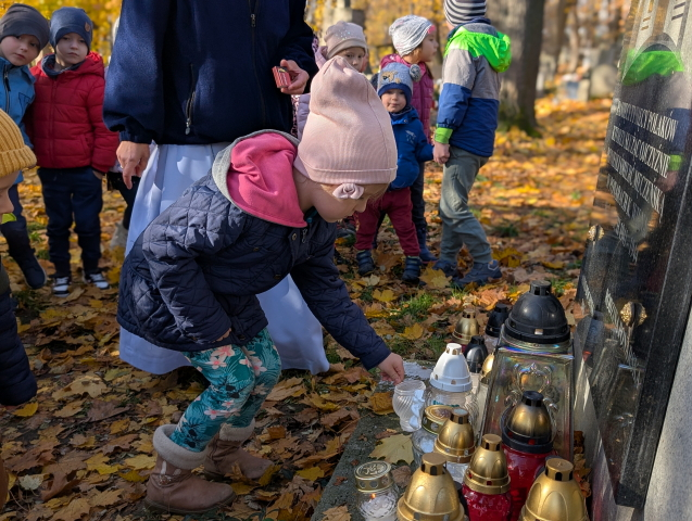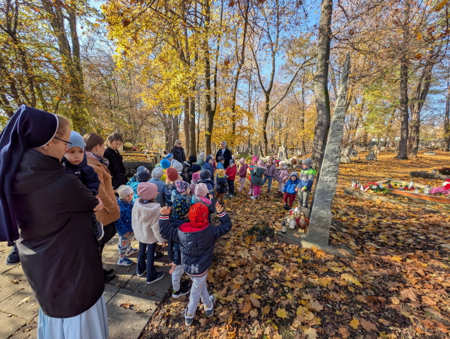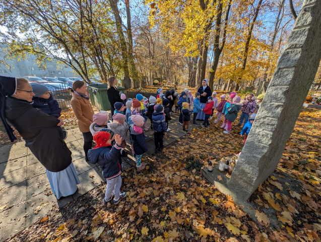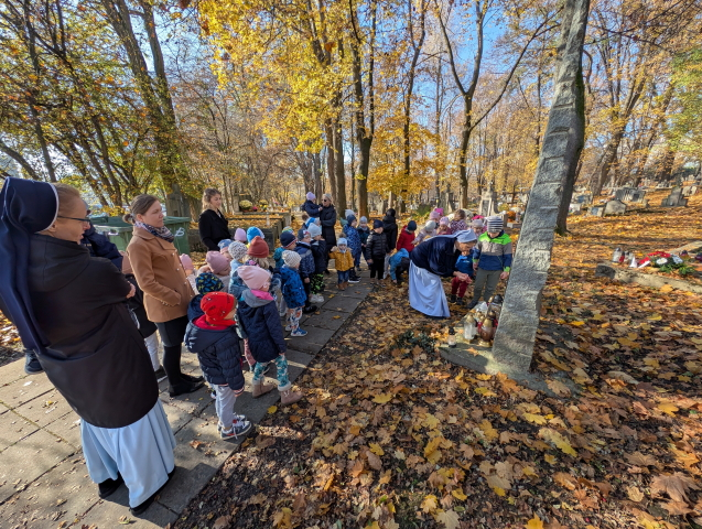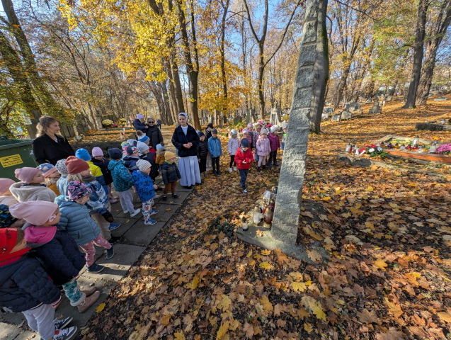 Z okazji Uroczystości Wszystkich Świętych dzieci z naszego przedszkola wybrały się na cmentarz Św. Rozalii. W ciszy i skupieniu zapaliliśmy znicz oraz pomodliliśmy się przy grobie żołnierzy, oddając hołd tym, którzy odeszli, a szczególnie tym, którzy oddali życie za naszą ojczyznę.  Był to piękny i pełen zadumy moment, który pozwolił dzieciom zrozumieć znaczenie pamięci o zmarłych i szacunku dla miejsc spoczynku. Po modlitwie udaliśmy się na krótki spacer po cmentarzu i jego okolicy, korzystając z pięknej, słonecznej pogody.  Spacer w jesiennych promieniach słońca był spokojnym zakończeniem tego wyjątkowego wyjścia. To była lekcja pamięci, wdzięczności i ciszy, która na długo pozostanie w sercach naszych przedszkolaków.