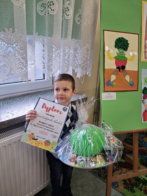 W Publicznej Szkole Podstawowej nr 11 z Oddziałami Integracyjnymi odbyła się V edycja przeglądu talentów i umiejętności artystycznych pod hasłem „Wyobraźnią malowane”. W tym roku uczestnicy przygotowywali pracę plastyczną pt. „Mam te moce – jem warzywa i owoce”. Naszą Ochronkę reprezentował Fabian Podgórski – Skarbek z grupy Mrówek. Konkurs stał się okazją do promowania zdrowych nawyków żywieniowych wśród dzieci. Dziękujemy rodzicom za wsparcie, a Fabianowi życzymy dalszych sukcesów.