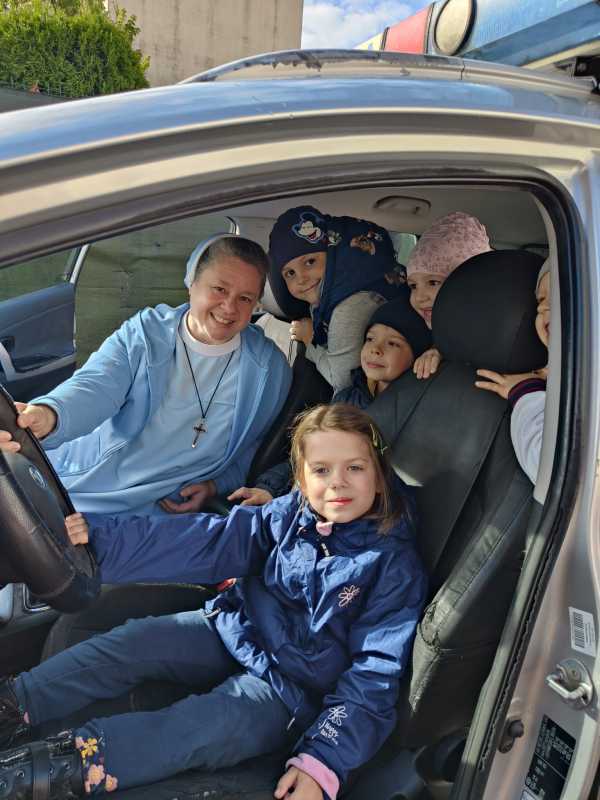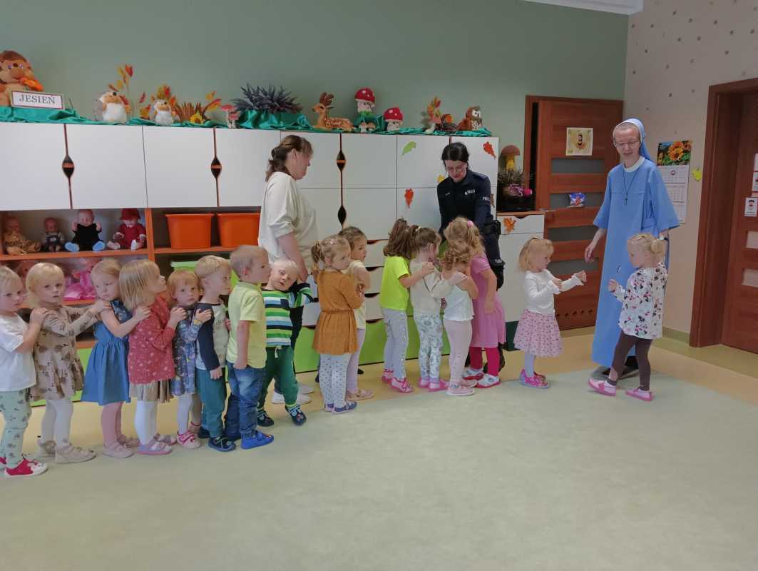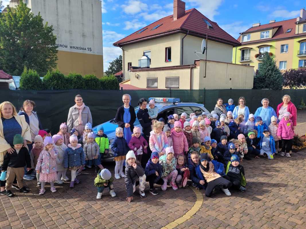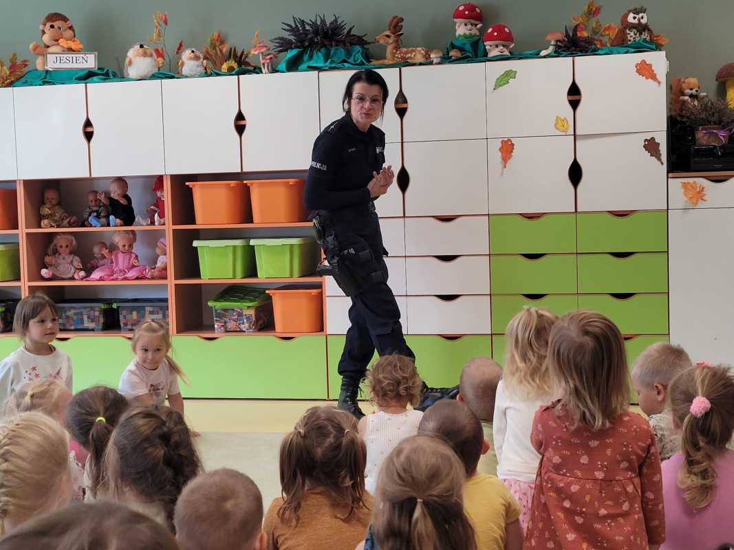 Spotkanie rozpoczęło się w sali, gdzie funkcjonariuszka opowiedziała przedszkolakom m.in. jak zachować się na drodze, co zrobić w sytuacji zagrożenia i jak wezwać pomoc. Dzieci dowiedziały się, dlaczego warto znać swój adres i kiedy dzwonić pod numer alarmowy. Było dużo pytań, ciekawostek i wspólnej rozmowy.