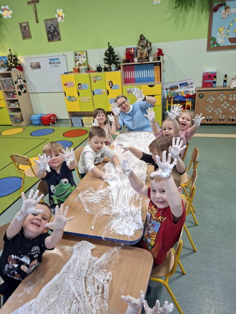 Gdy śnieg przykrył świat, my bawimy się wesoło w salach. Śpiewamy zimowe piosenki, rozmawiamy o zimie i tworzymy mroźne obrazy. Dziś u „Biedronek” było prawdziwie zimowo i bardzo wesoło! Korzystając z uroków zimy naśladowaliśmy jej wytwory i chcieliśmy poczuć jak to jest w miękkim puchu. Udało się, to nam wspaniale!!!! Był, to dzień pełen uśmiechu i zimowego szaleństwa w sali!!