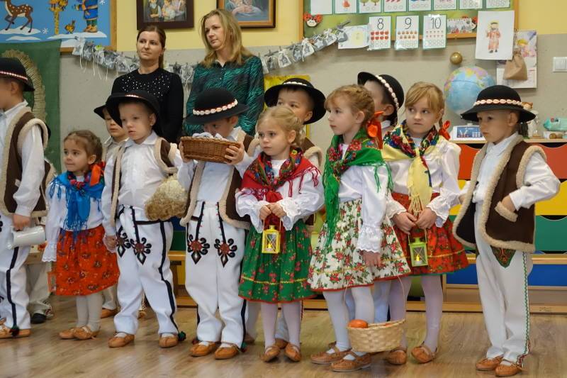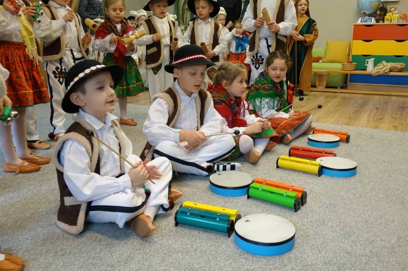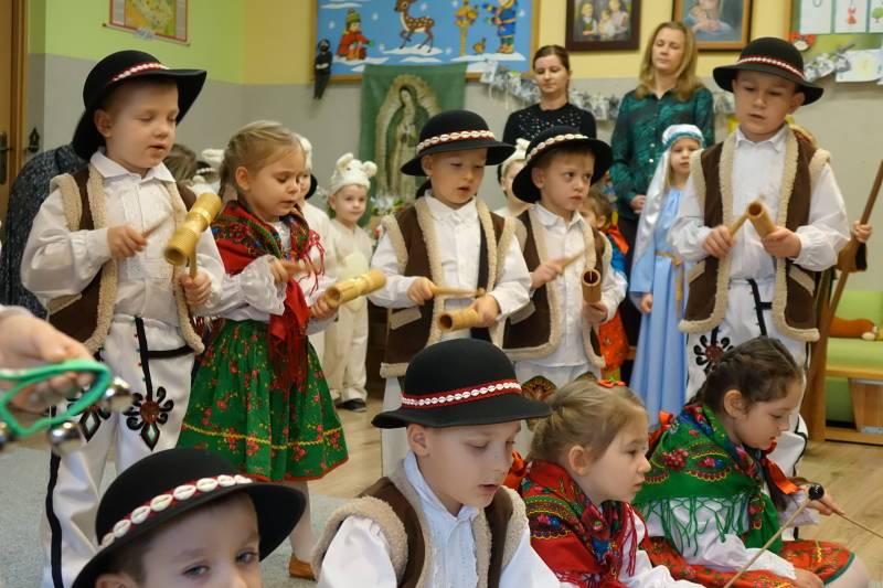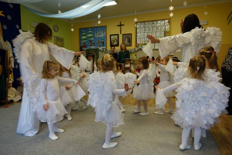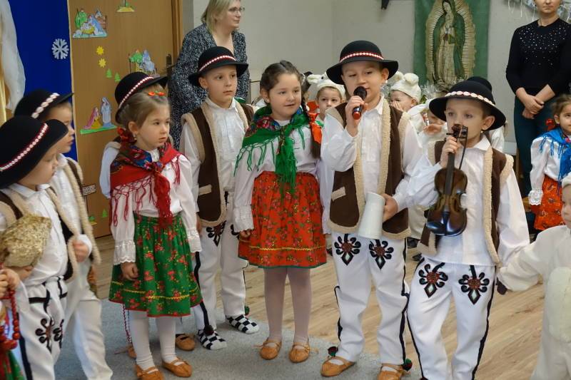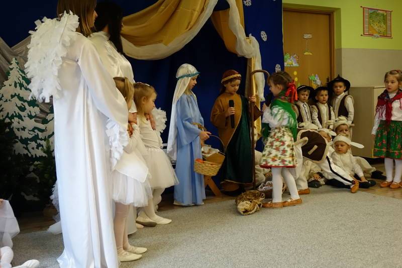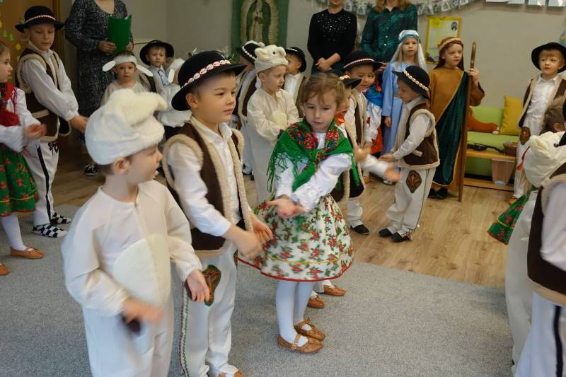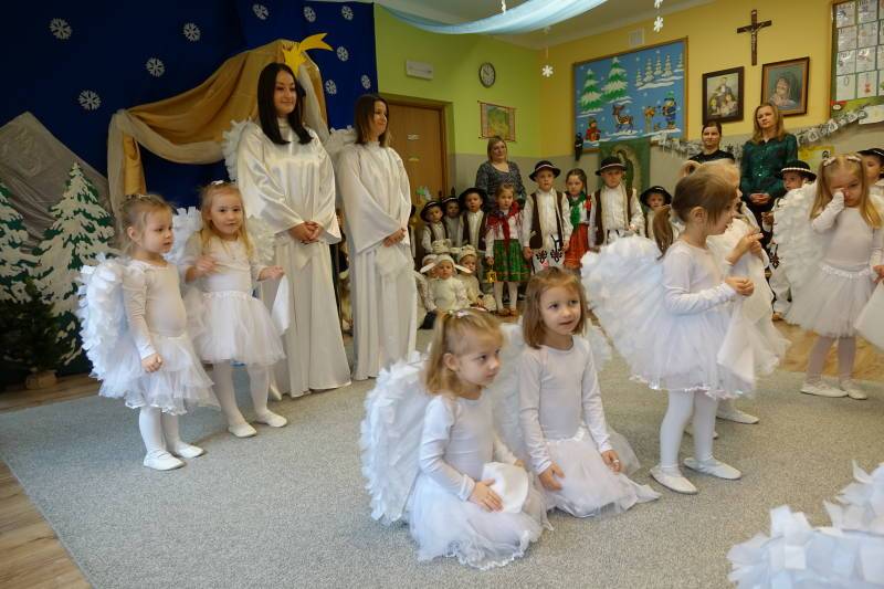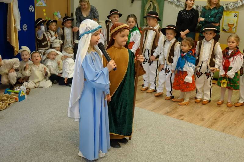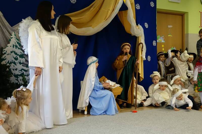 Jasełka rozpoczęła Pani Żaneta występując w roli narratora następnie dzieci z wielkim zaangażowaniem przedstawiły sceny narodzin Jezusa. Podczas występu pastuszkowie, górale, góralki, królowie, aniołowie oraz owieczki symbolicznie odwiedzili Świętą Rodzinę w betlejemskiej stajence. W role aniołów wcieliły się również dwie mamy, co było pięknym znakiem wspólnoty i zaangażowania rodzin w życie naszej ochronki. Mali artyści oddali tę wyjątkową chwilę poprzez śpiew pastorałek, taniec, grę na instrumentach oraz recytację wierszy, tworząc wzruszający i radosny spektakl bożonarodzeniowy.