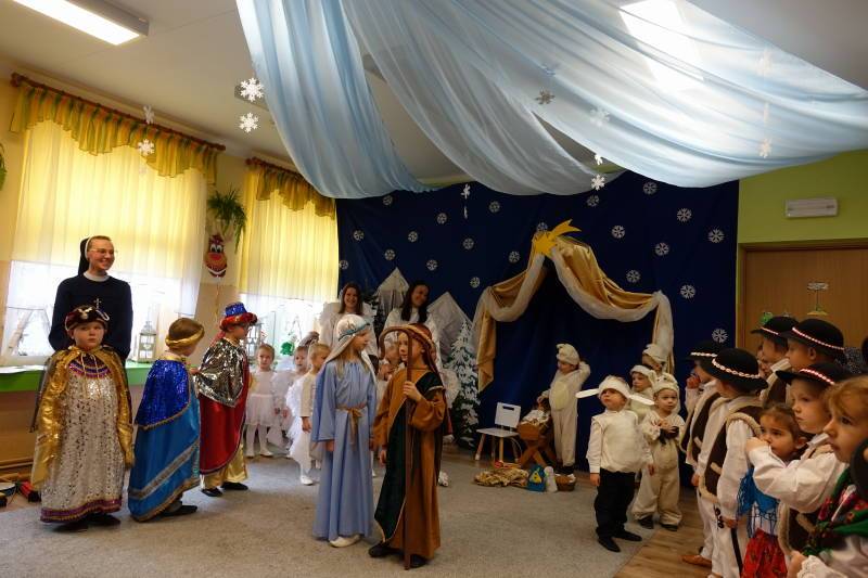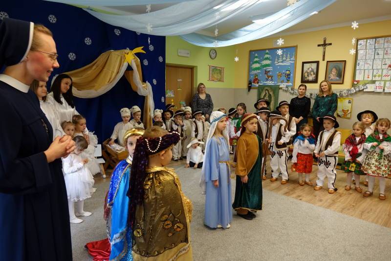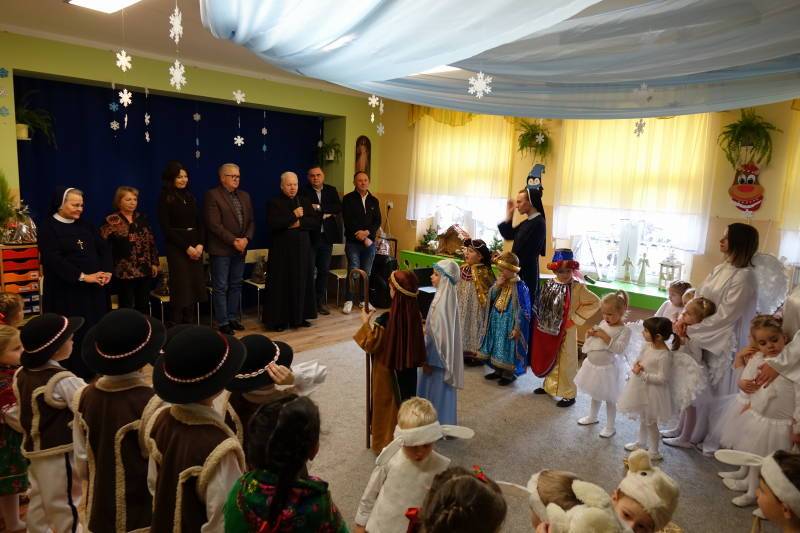 Po zakończonym występie Siostra Dyrektor skierowała serdeczne słowa do wszystkich zaproszonych gości, dziękując za ich obecność oraz składając świąteczne życzenia pełne pokoju, radości i Bożego błogosławieństwa. Następnie głos zabrał Ksiądz Proboszcz, który w imieniu wszystkich gości podziękował za zaproszenie oraz za piękne, wzruszające jasełka. Składając życzenia bożonarodzeniowe, wyraził wdzięczność i serdeczność wobec dzieci oraz wszystkich pracowników naszej ochronki, życząc zdrowia, radości i wielu łask płynących od Nowonarodzonego Jezusa.